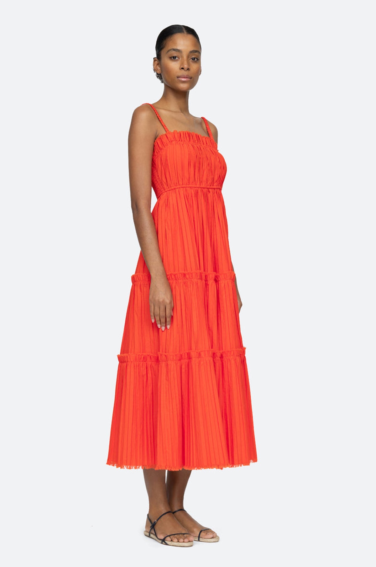 The Greir pleated slip dress from Sea New York exudes summertime glamour and timeless style. Ornately decorated with feminine pleats, it's cut with a square ruffled neckline and thin, ruched, elasticated straps, neatly nipping in at the waist and a tiered descent into a calf-grazing silhouette.