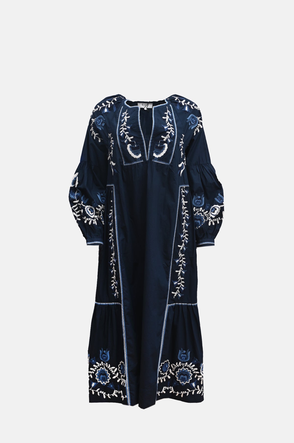 Inga is a navy, embroidered, maxi-length tunic-style dress from Sea, New York. Made from 100% cotton it has a comfortable relaxed fit and feels cool and breezy on. The long sleeves with buttoned cuffs lend a tailored elegance to an otherwise casual dress which is heightened by the gorgeous craftmanship that can be seen throughout. A veritable showstopper, this will make an elegant addition to your summer and holiday wardrobe.
