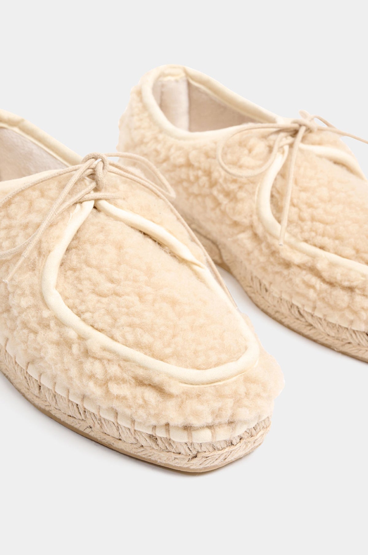 Wallabees are a moccasin inspired shoe. More dressed up than a sneaker but not as stuffy as a hard bottom shoe we adore this fluffy sheepskin style pair from Naguisa. A low shaft shoe with cotton laces, the upper and insole are made of a natural wool fabric with a padded lining for extra comfort. The sole is made from a single jute braid with a round toe and feature a 3.5 cm wedge heel for a bit of a lift. A comfortable and stylish autumn shoe, the Txalupa Lace Up in Beige will keep your feet soft and cosy on cold days.