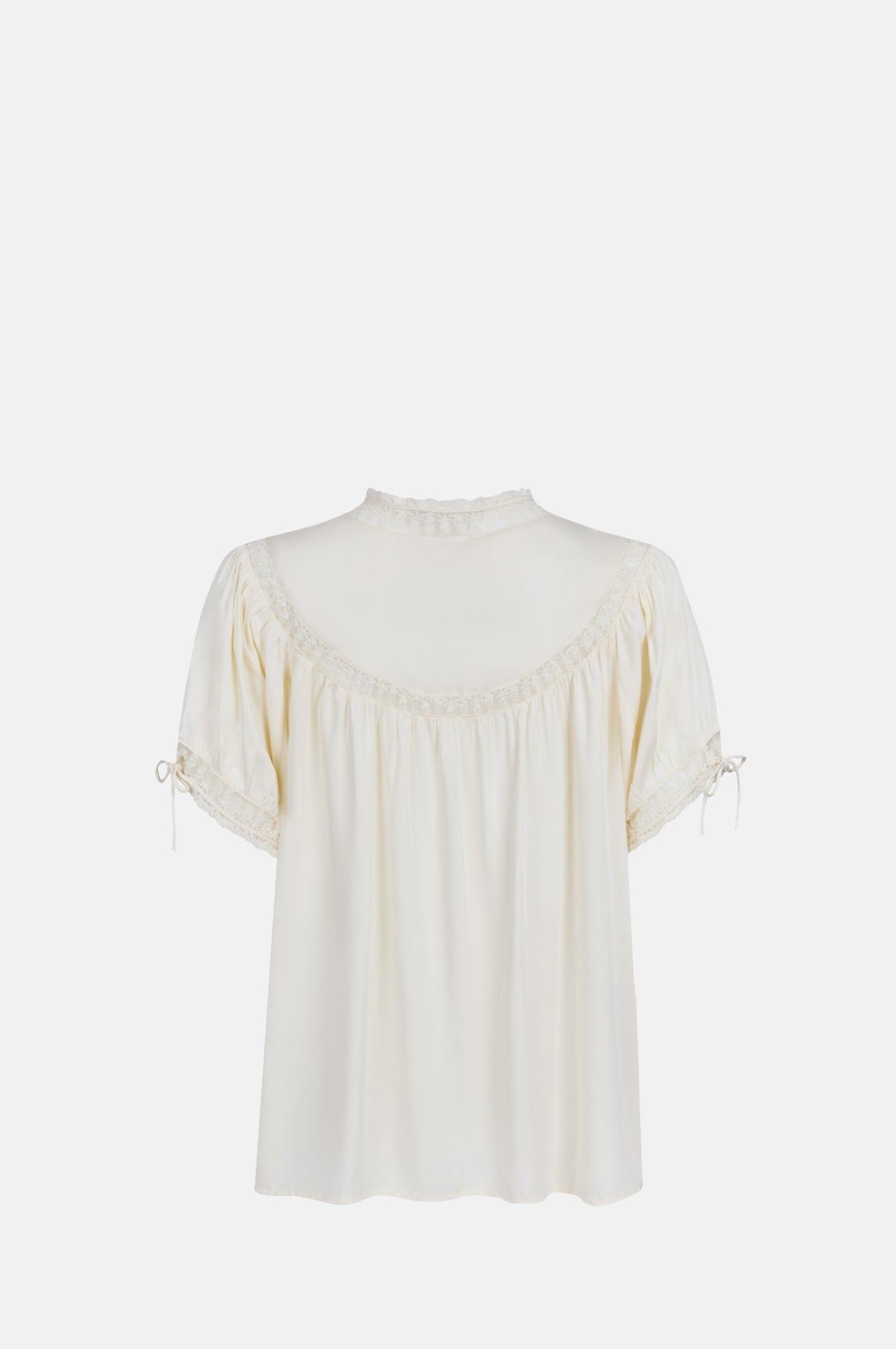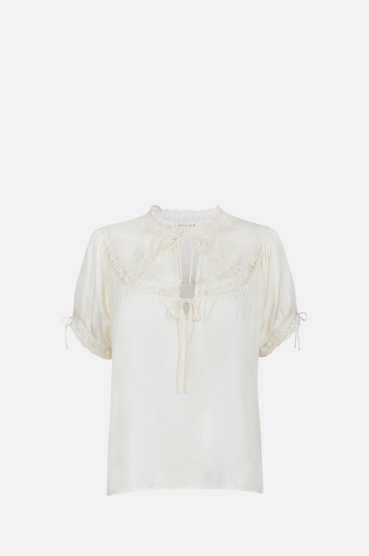 Cut from an off-white silky modal satin, the Willa Blouse is a romantic and feminine piece that elevates everyday dressing. Slightly blousey cap sleeves that are trimmed with lace frame the blouse and repeating lace inserts detail the neckline. With a light, flowing silhouette and tie accents, she's a dream to wear.