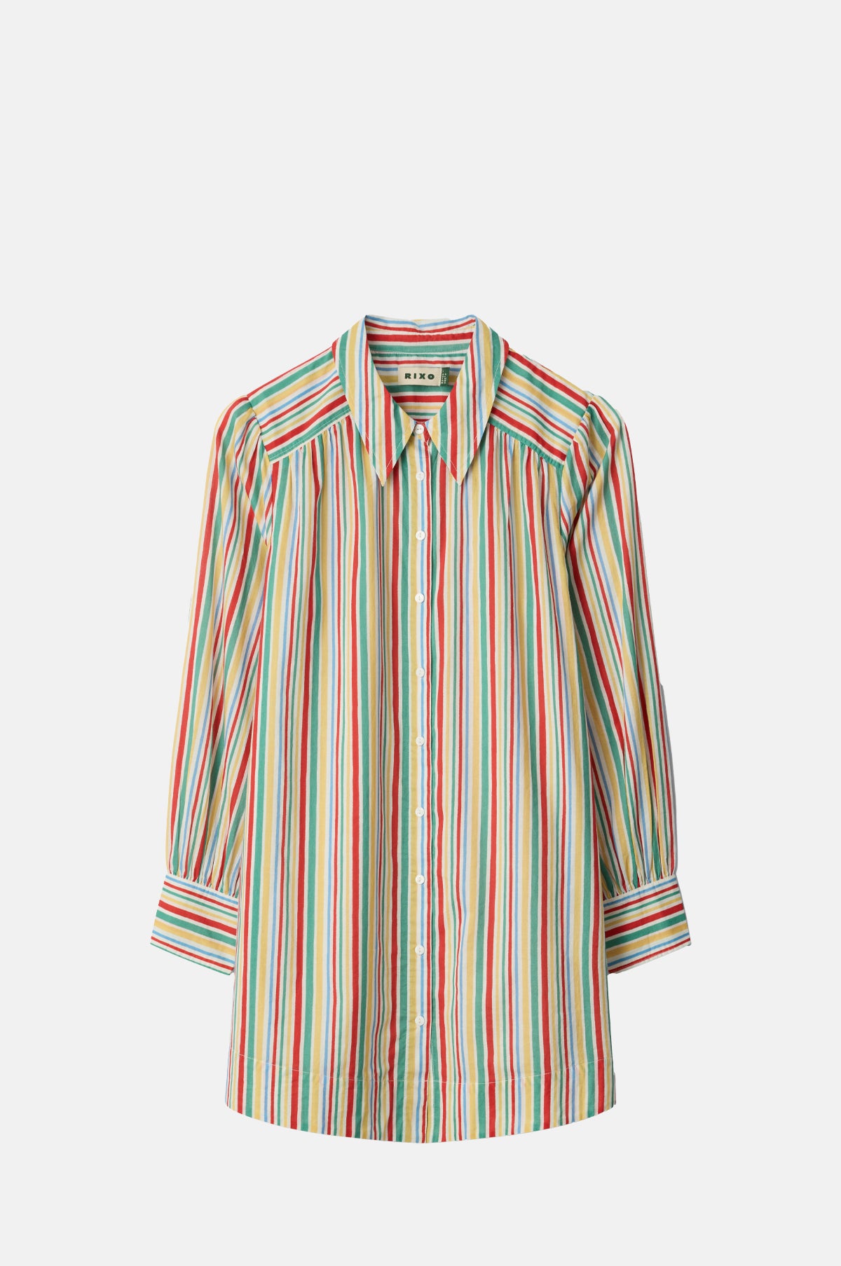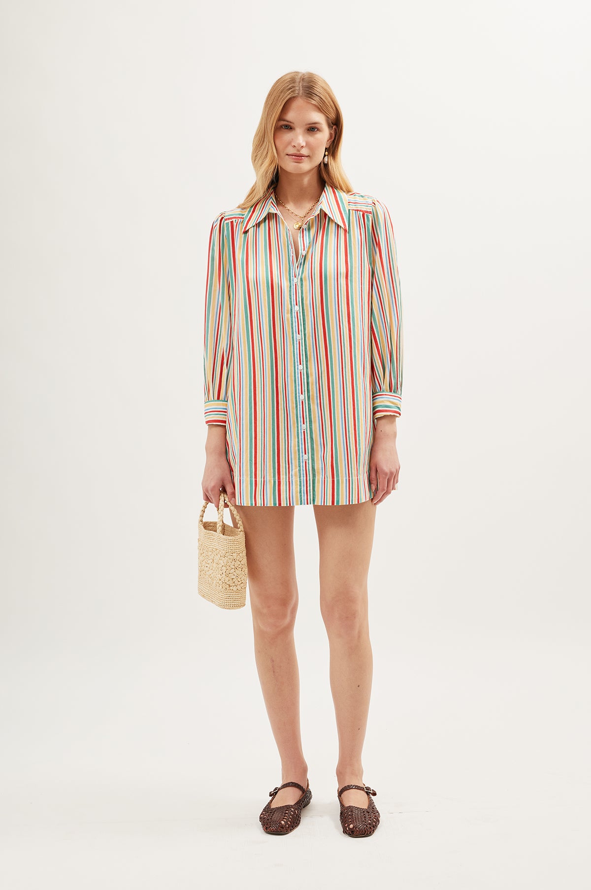 Patterned in a happy-making stripe, the Ashlynn Top is a hero piece for your Spring/Summer wardrobe. Thanks to generous length it can be worn as an oversized shirt or as a mini dress. Crafted from a crisp cotton, it holds its boxy shape and has traditional shirting details like buttoned cuffs, back yoke and button-down front. We intend to wear ours on the beach, layered up with gold jewelry and paired with sandals.