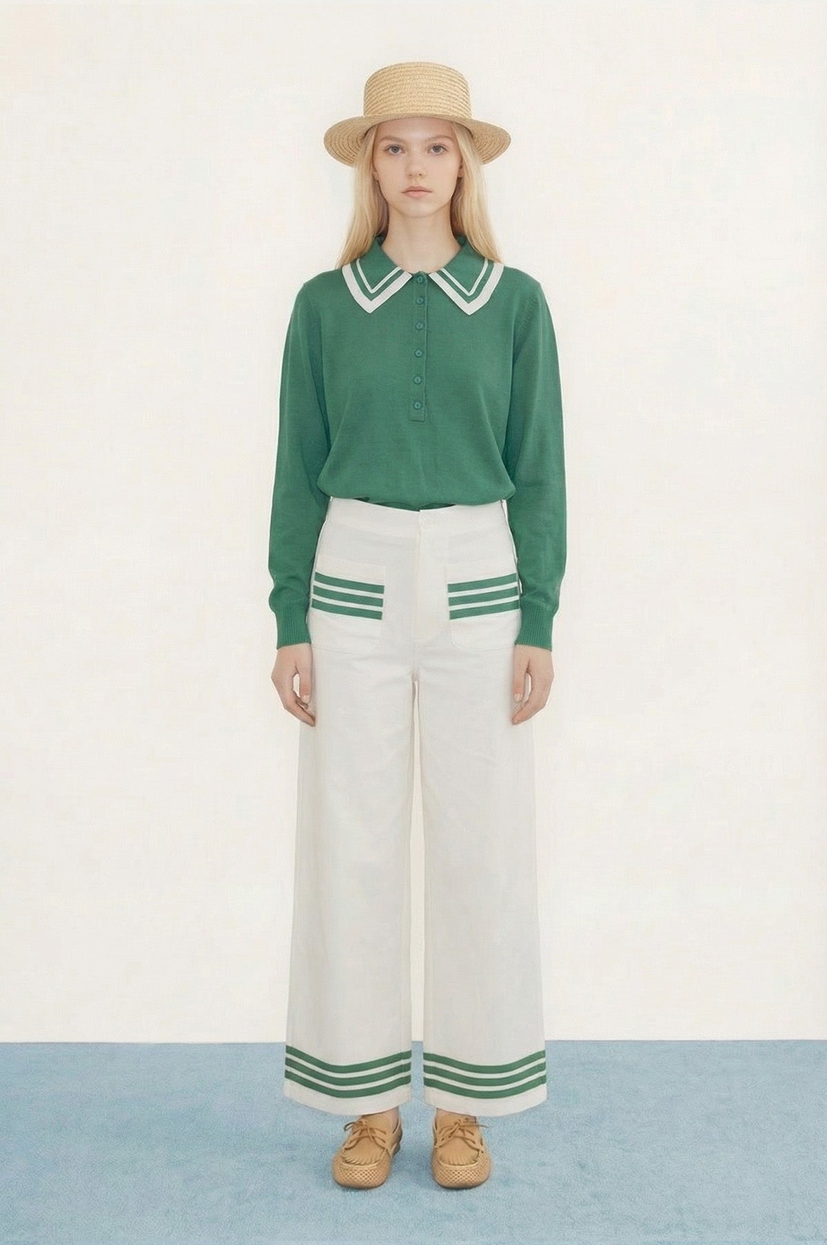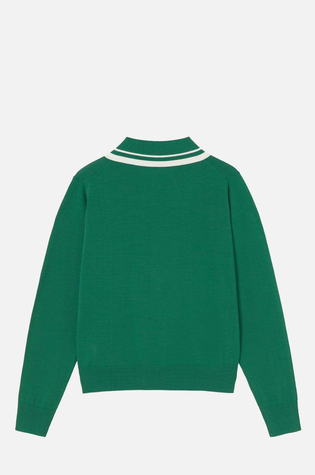 We are embracing the varsity vibes from this polo and in its cheerful shade of emerald green we couldn't be happier about it. With classic polo detailing like a button-front placket, long sleeves and ribbed cuffs and hem, it is accented by its collar trimmed with two contrasting white stripes. A fantastically versatile piece we will be pairing ours with a corduroy trouser for a subtly sporty look.