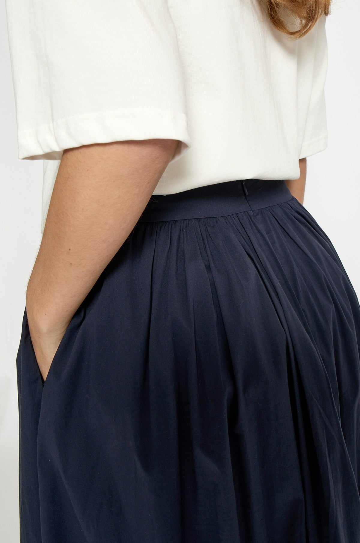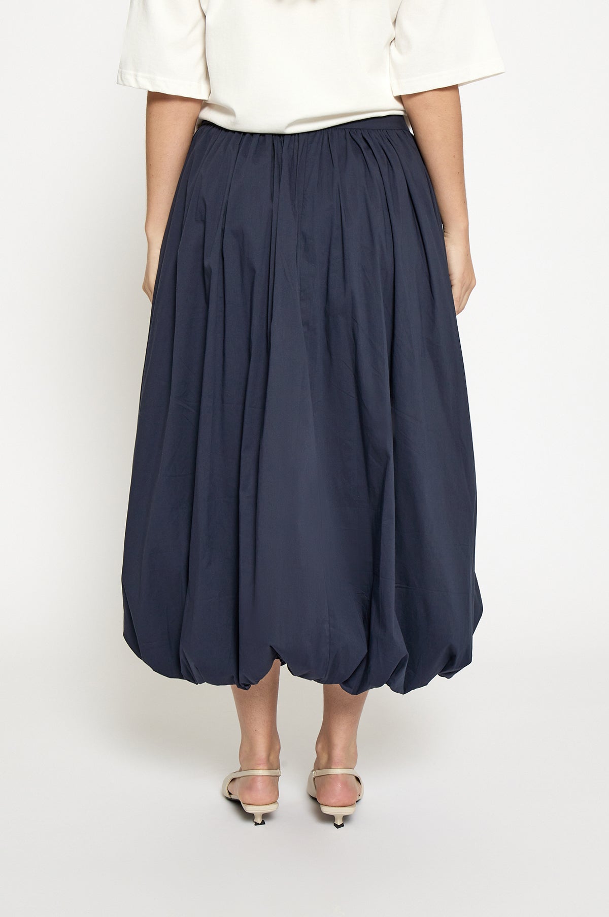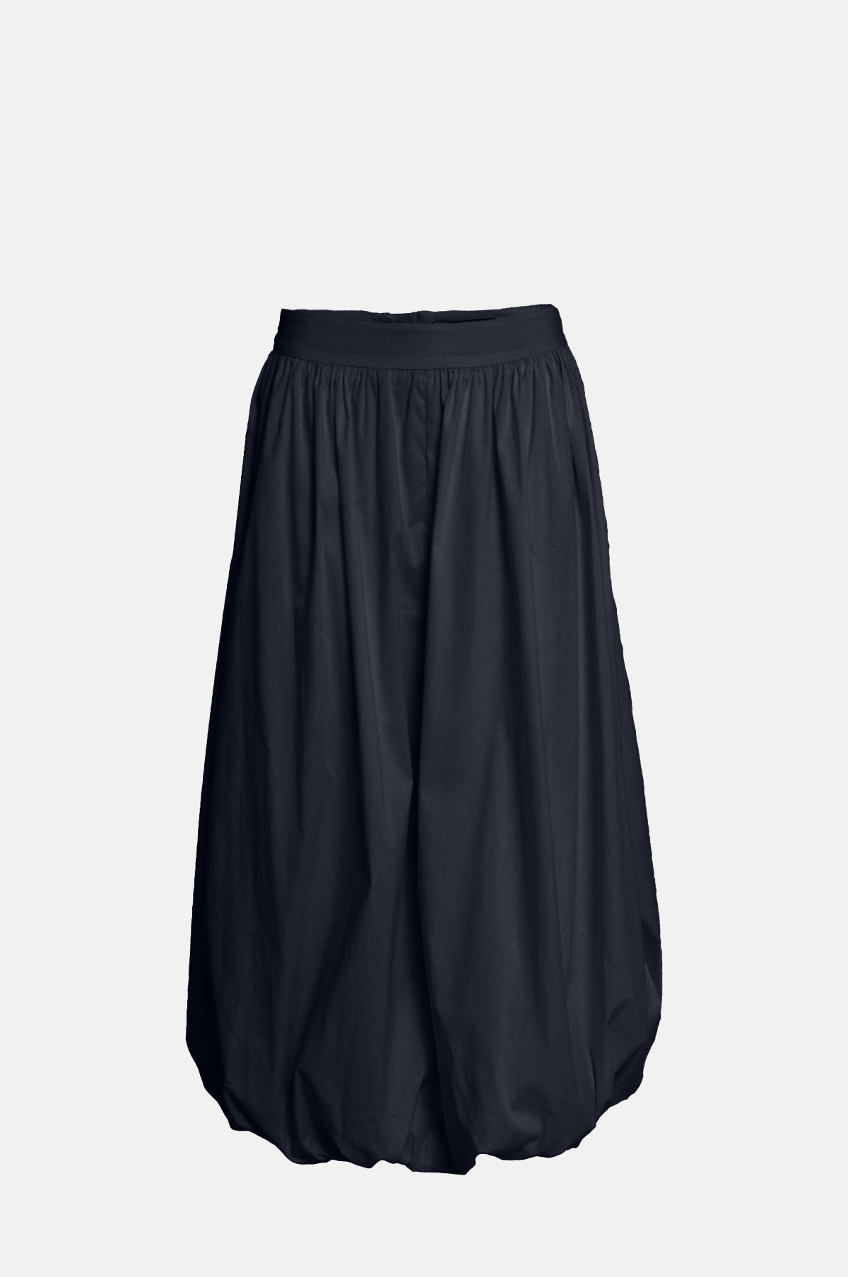 Sculptural in shape, the Oline Midi Skirt gracefully falls and scoops into a voluminous bubble skirt. Its midi silhouette is enhanced by gathering that edges the waistband. Spun from a lightweight cotton blend, this navy skirt will be worn on rotation during the balmier months.