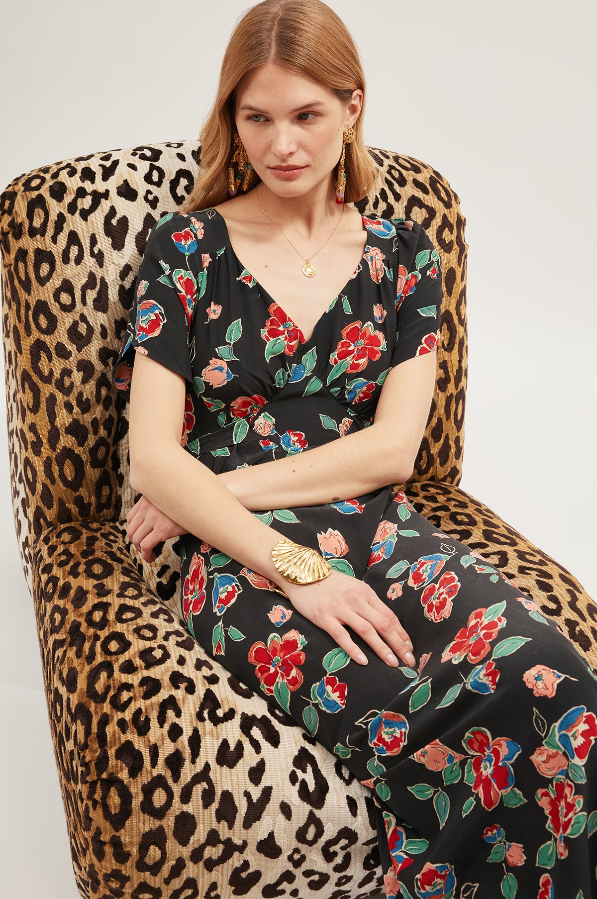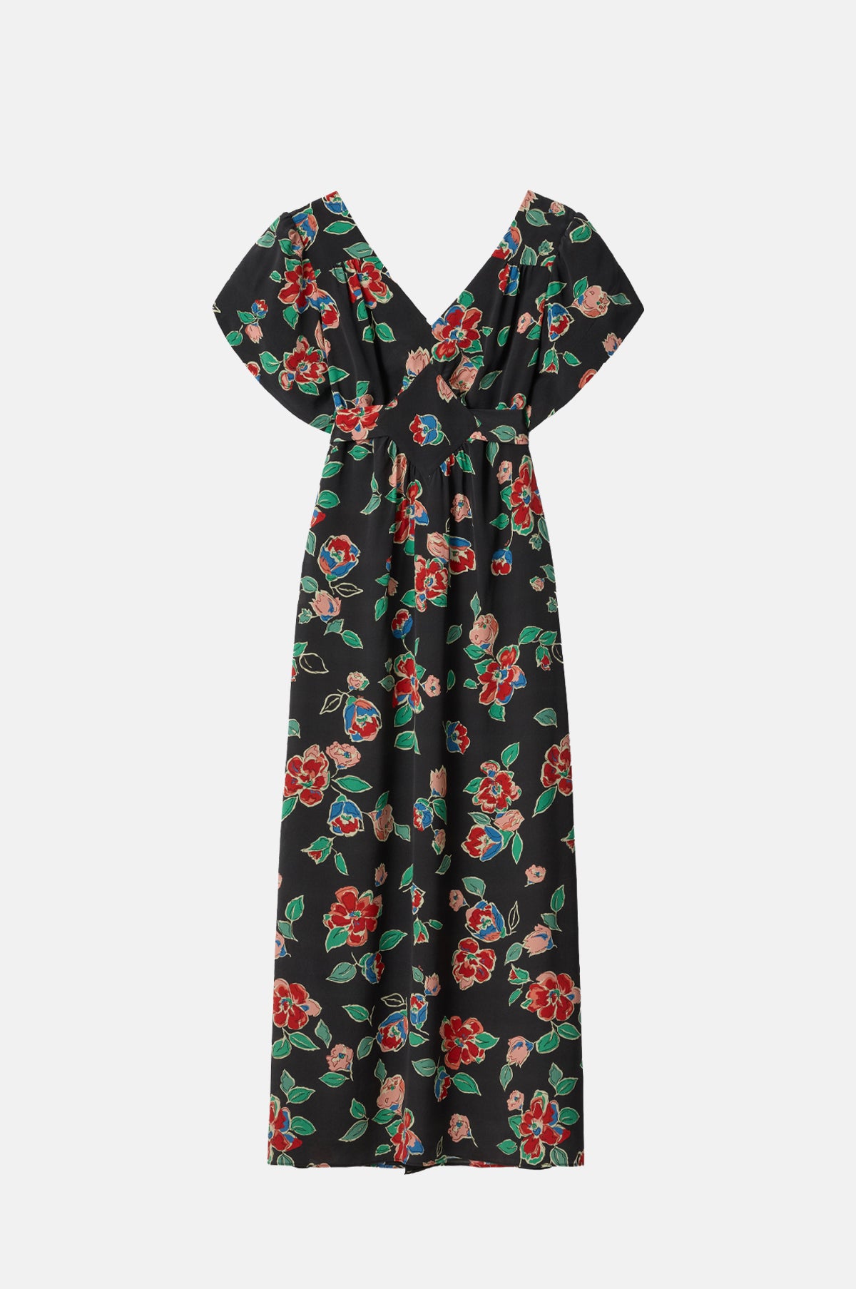 Cut from a lightweight silk, the Riella is a midi-length black dress patterned in a pretty repeating floral. Cap sleeves frame the dress and the empire waist provides a flattering drape which is enhanced by the signature bias cut. Waist-cinching ties accentuate the shape and make this an elegant choice for all manner of occasions.