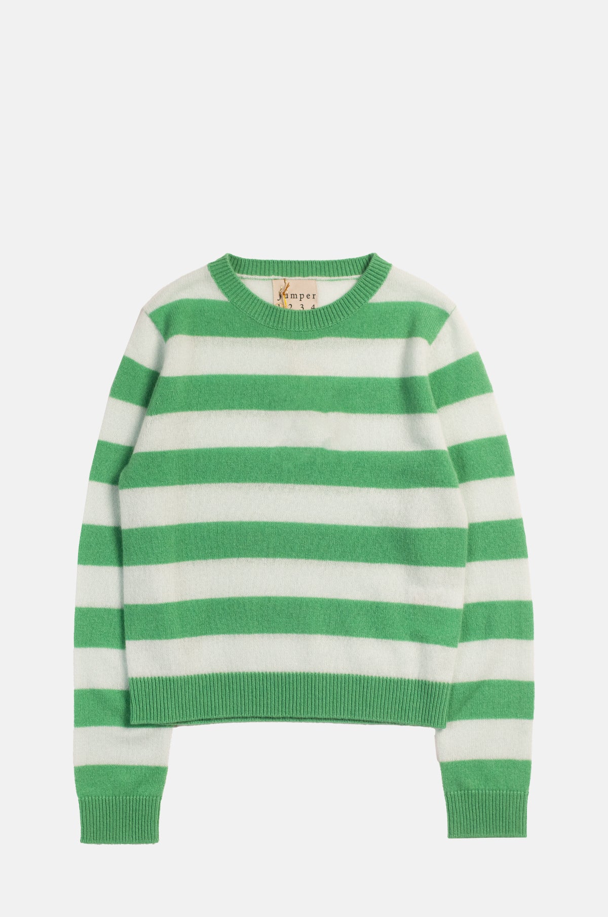There is something about a bold stripe knitwear that is hard not to love. A little more playful than a plain jumper but not as stand-out as a patterned design, the medium-width stripe lets you easily add an extra colour dimension with a cool edge. When paired with a simple, regular shaped style in a light/medium weight, slightly open weave cashmere knit, you can really let the colour do the talking. This one is in a bright green and light minty green.