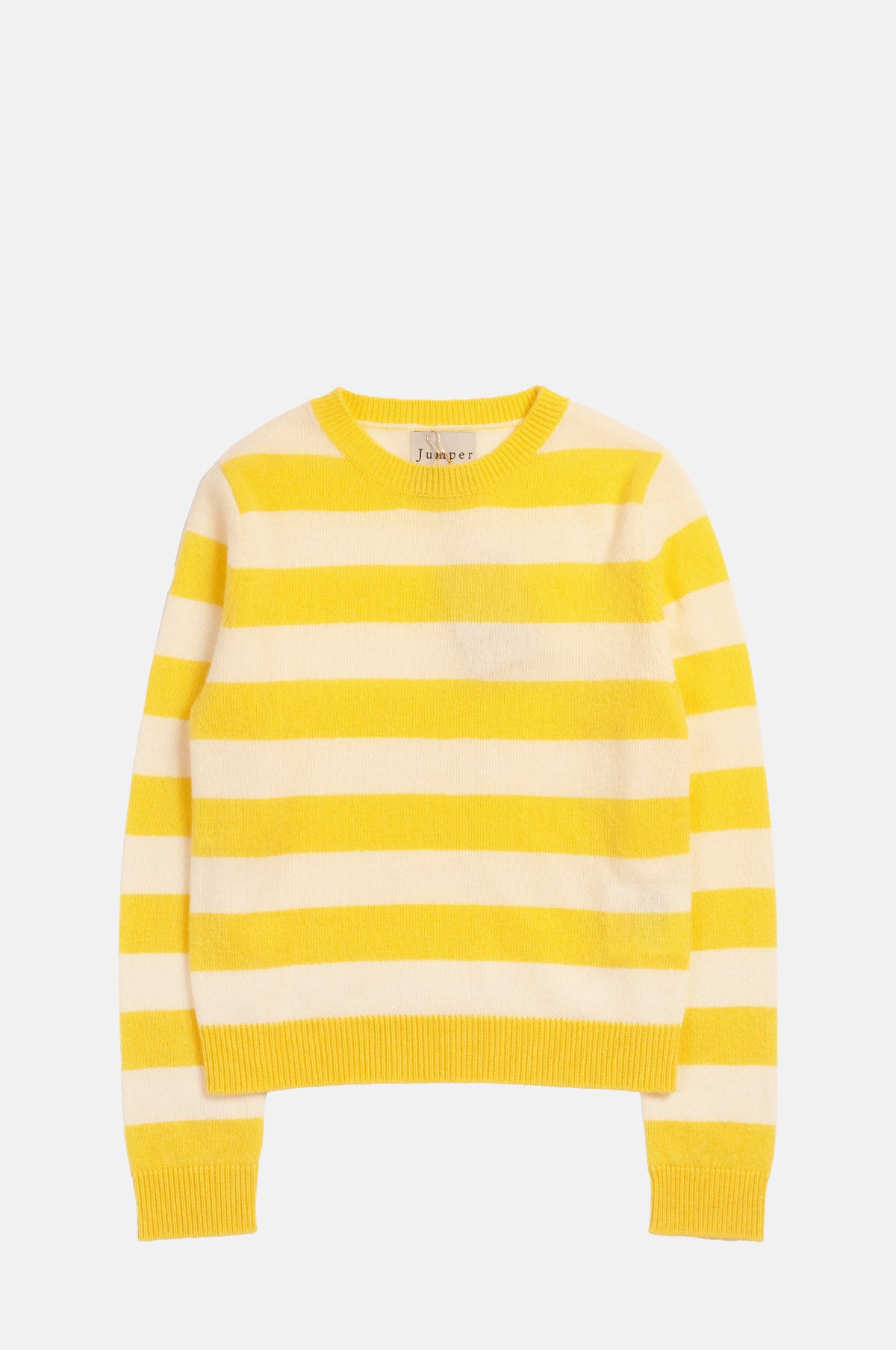 There is something about a bold stripe knitwear that is hard not to love. A little more playful than a plain jumper but not as stand-out as a patterned design, the medium-width stripe lets you easily add an extra colour dimension with a cool edge. When paired with a simple, regular shaped style in a light/medium weight, slightly open weave cashmere knit, you can really let the colour do the talking. This one is in a bright sunshine yellow and cream.
