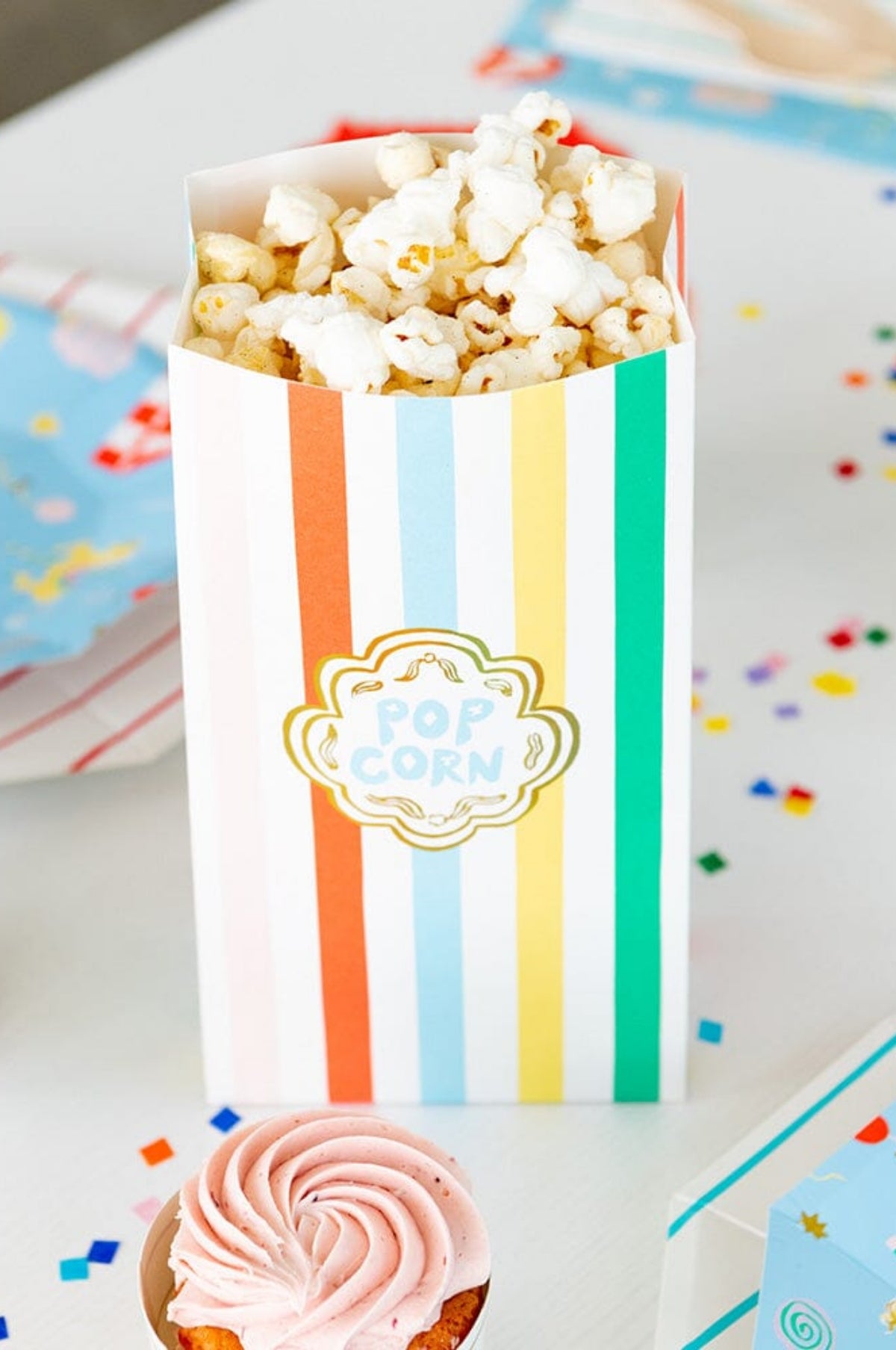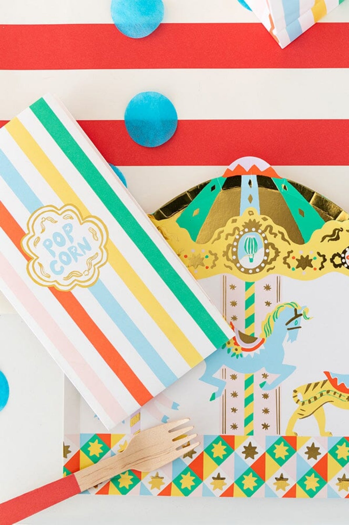 Carousels and cotton candy...oh my! Featuring carnival-inspired colors and pops of gold foil, these favour bags bring all the fun of the fair! We think they're perfect for fair, carnival, and circus parties as well as for movie nights at home!