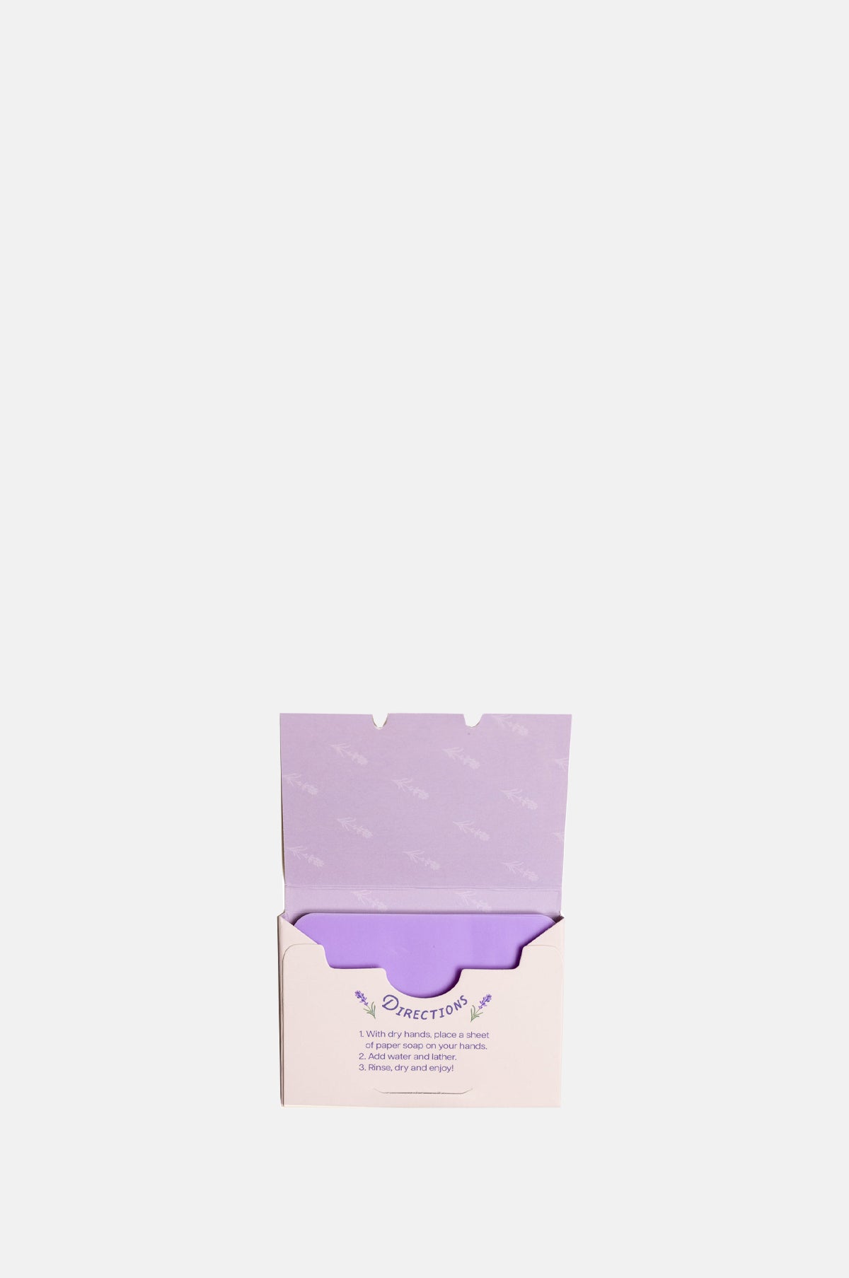 Perfect for popping into your toiletry or gym bag, these fragrant paper soaps from 123 Farm are ideal for on the go freshness. These paper soap sheets dissolve in water and will leave your hands clean, soft and lightly scented. Comes in three scents: this one smells of lavender.