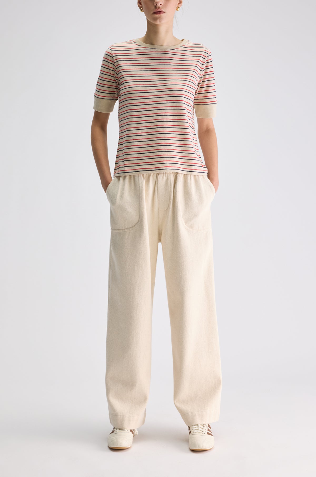 - Ecru with red and navy stripe pattern