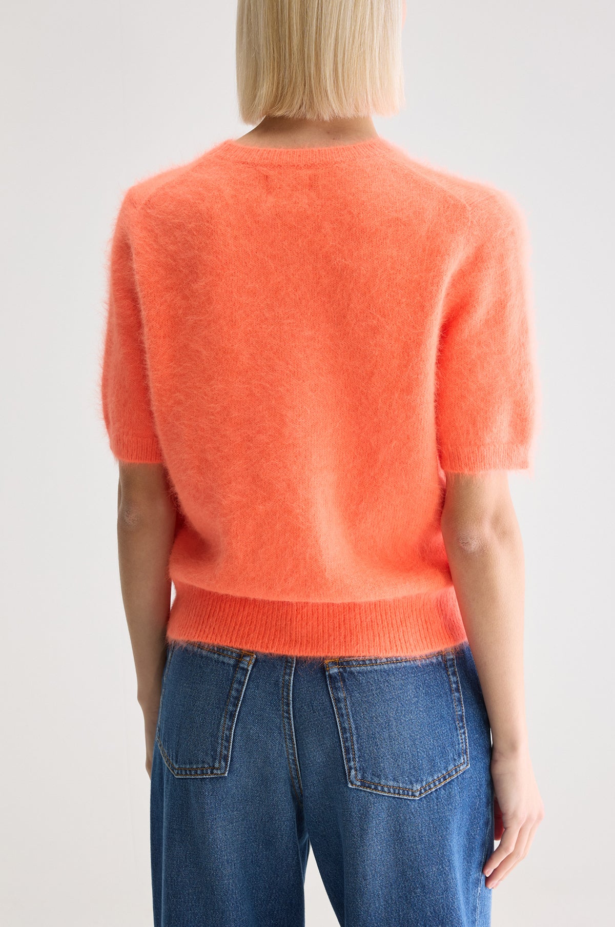 This bright orange short-sleeved jumper from Bellerose will brighten any wardrobe. Made from an angora blend, this fluffy knit is lightweight and soft to the touch. With its slim fit, round neck, and ribbed hem it is a flattering choice for any occasion.