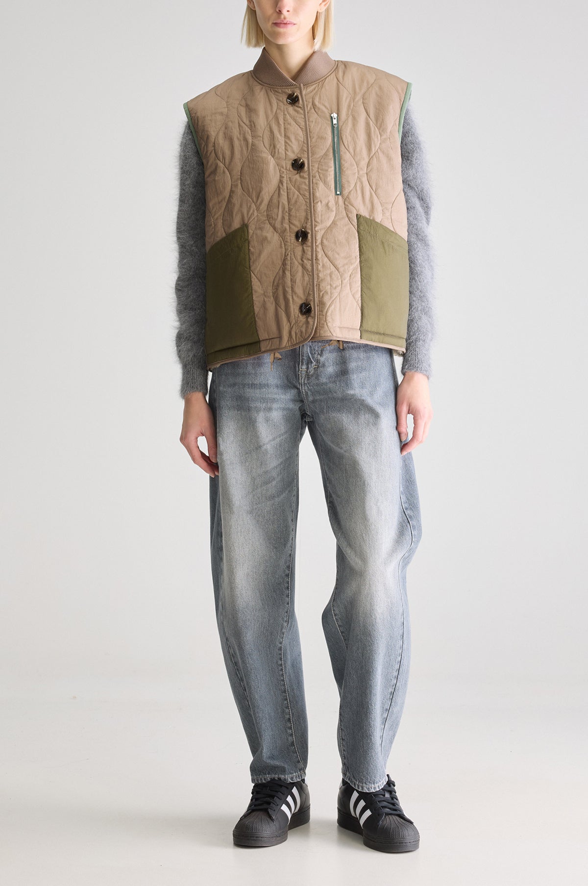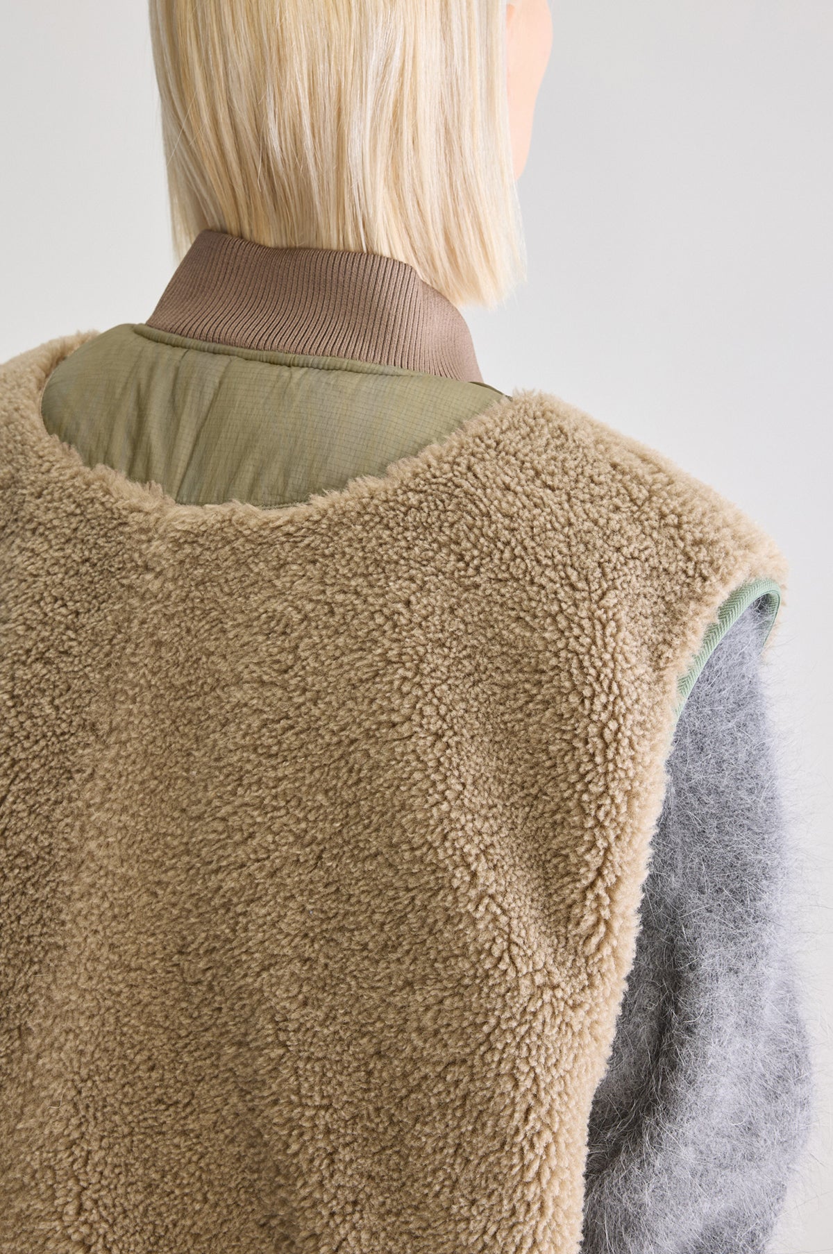 This reversible taupe vest from Bellerose encapsulates the Belgian brand's decidedly playful take on utilitarian fashion. Made from quilted nylon ripstop on one side with contrast pockets, and a soft teddy-bear fleece on the other - it has a high ribbed neck, button down front, and toggle pulls at the hem for an adjustable fit. A great transitional layer this is a lovely option for cooler months.