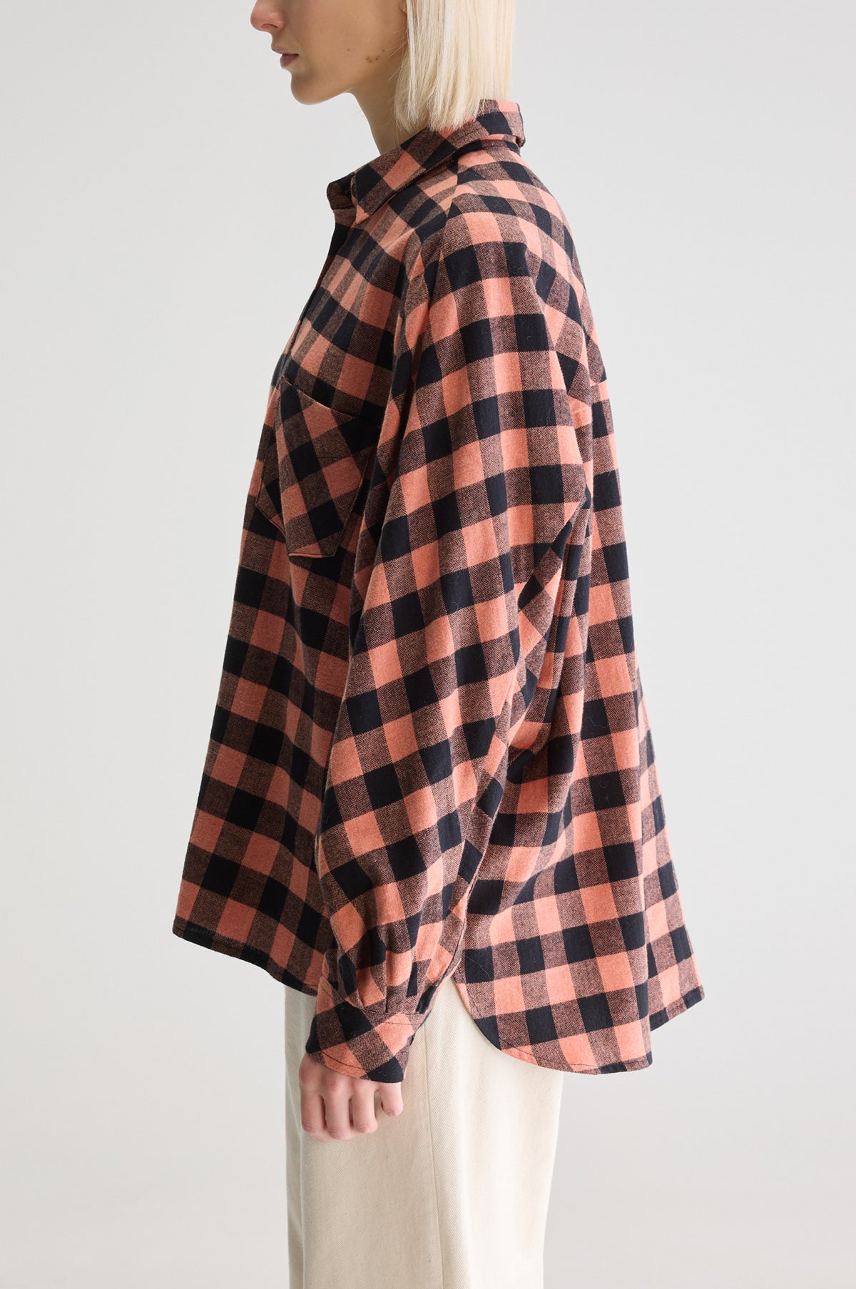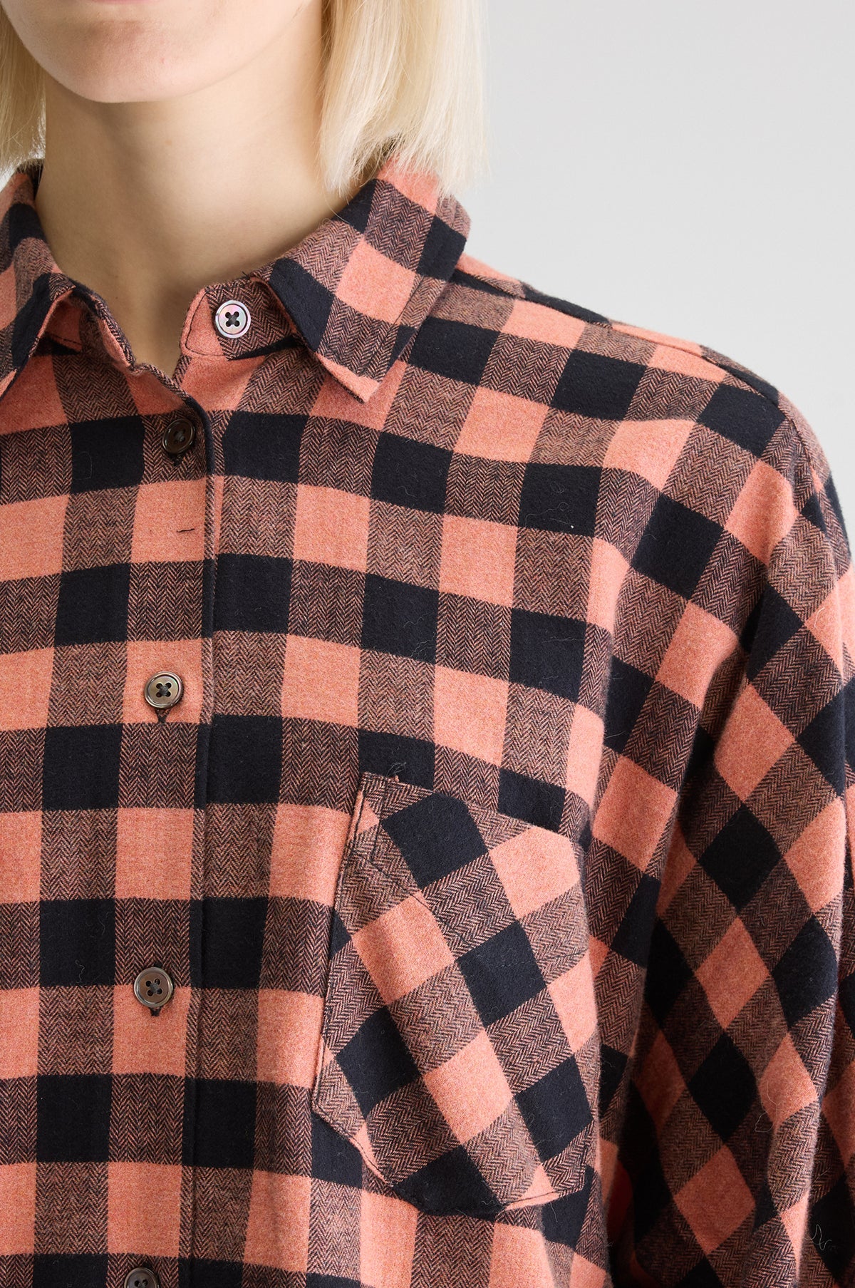 Part of the iconic image of the American frontier, flannel shirts have been a fashion staple since the mid-20th century. Known for being able to hold its own against harsh weather and arduous conditions - it has been linked to everyone from Paul Bunyan to Kurt Cobain. Made from the softest brushed cotton, this black and neon orange checked shirt from Bellerose is a fun take on this American classic. Timeless details like the button down front, relaxed fit, and curved hem give it a flattering shape making this a comfortable and stylish choice across seasons.