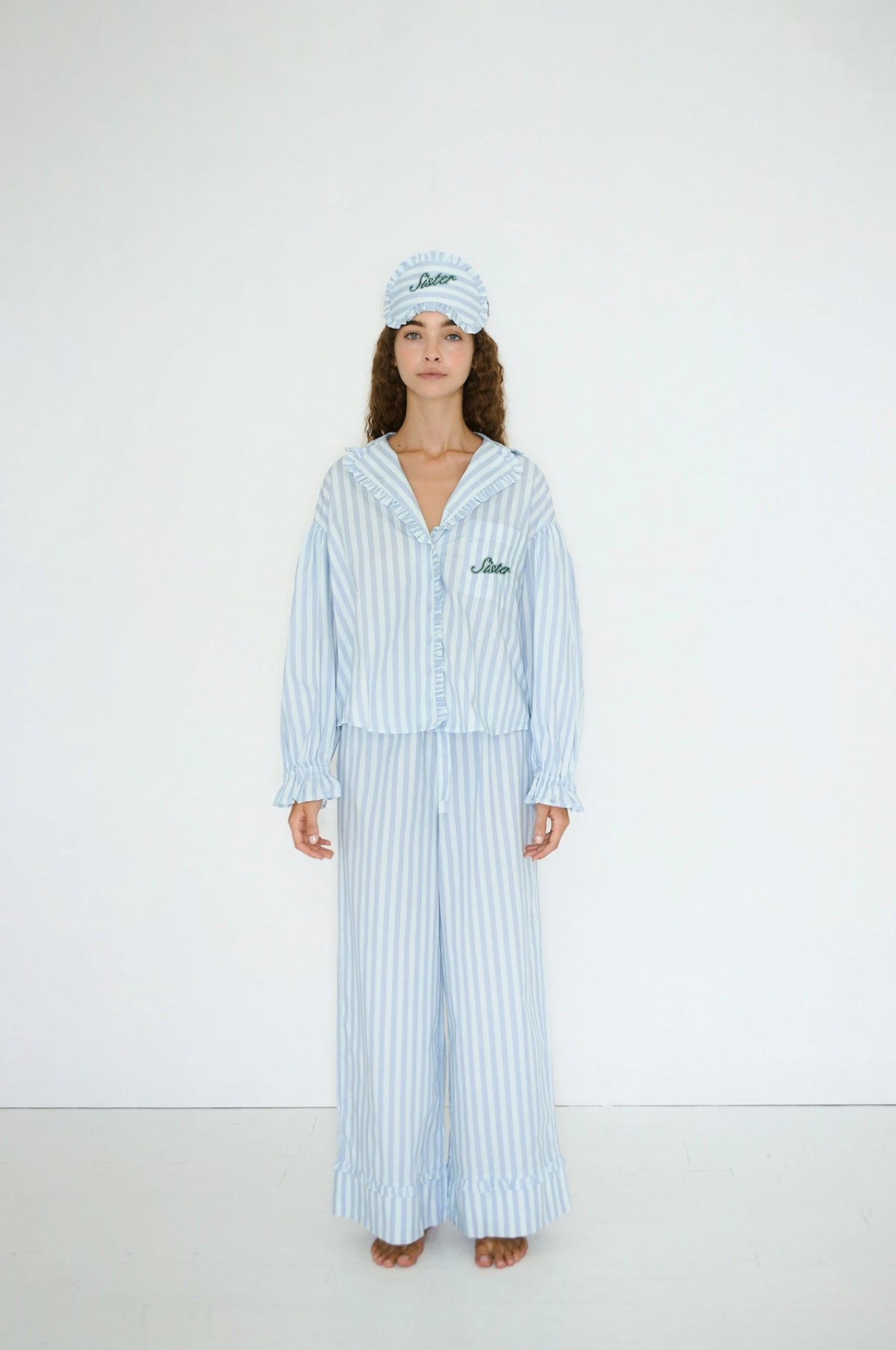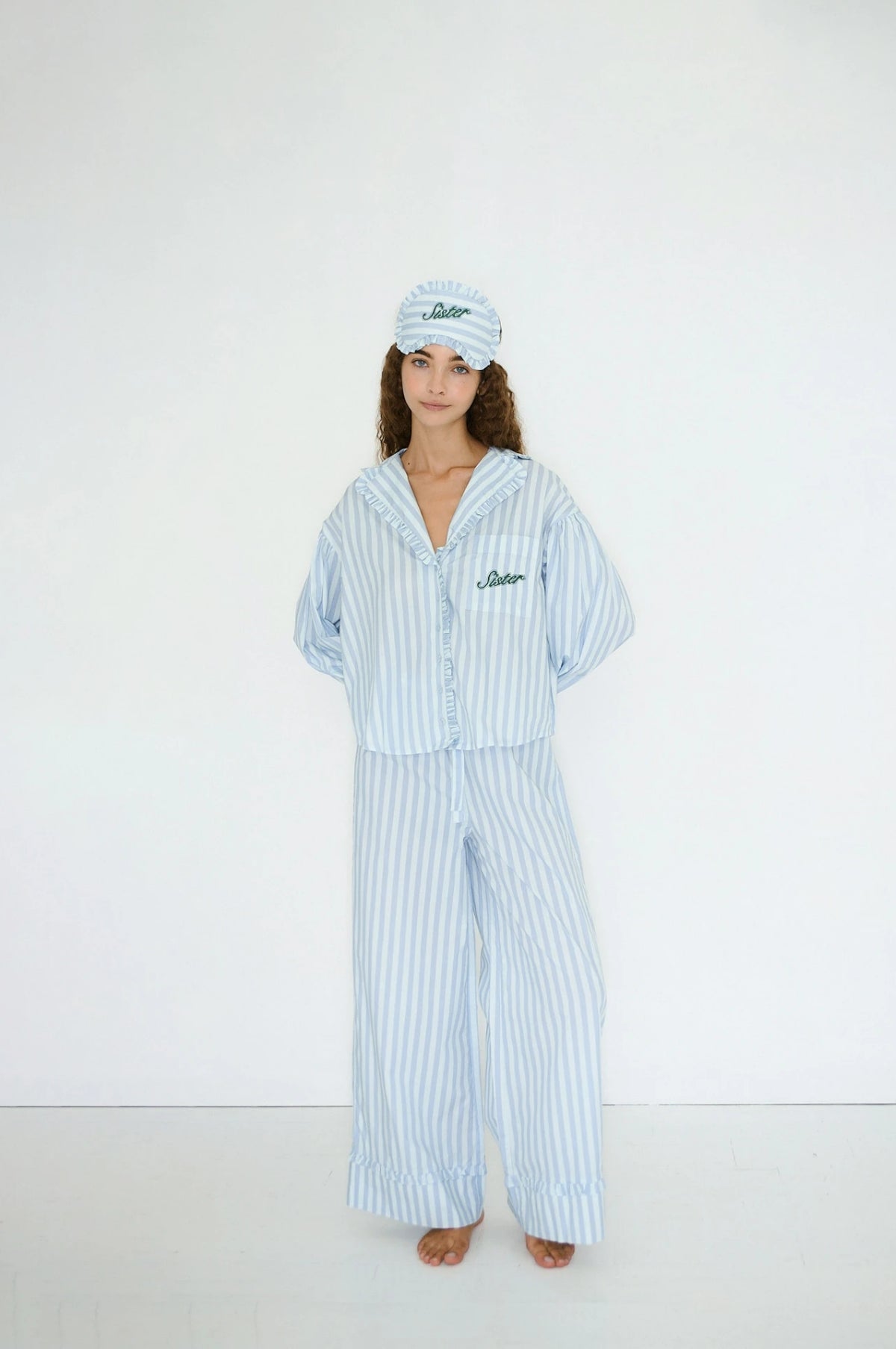 Crafted from paper-touch cotton poplin in a subtle printed blue stripe, this pyjama set includes a blouse, slip-on pants, eye mask, and a matching bag designed to hold all pieces. The blouse features delicate frill details and an embroidered logo, while the pants offer a wider leg shape and an adjustable waistband for ultimate comfort. A refined set designed for effortless relaxation. We can't wait to hit the hay in style!