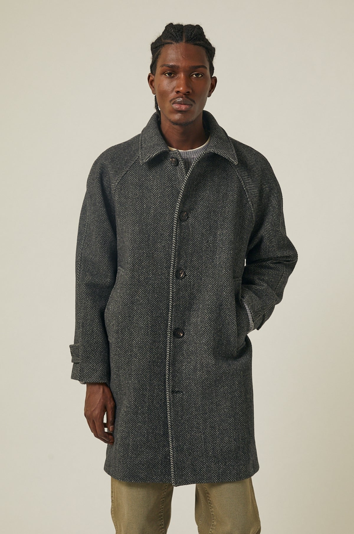 The herringbone raglan coat in charcoal is the perfect long coat with a traditional herringbone fabric but constructed of a soft wool making it incredibly warm and comfortable.