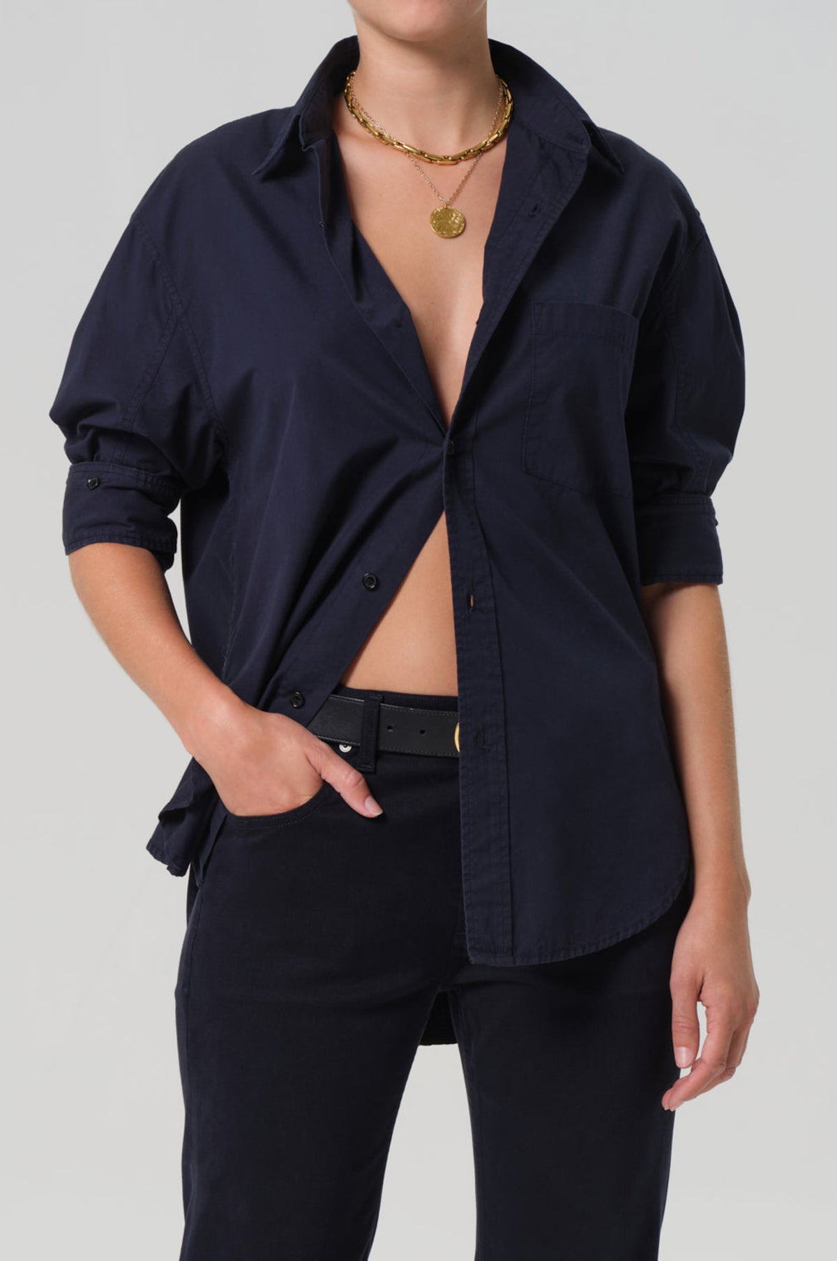 The Kayla Shirt is a must-have for every wardrobe. Made from a crisp navy cotton, its oversized silhouette and high-low hem give new dimension to a timeless staple. It is a refined yet relaxed piece that is versatile for styling and blends function, texture and understated sophistication.