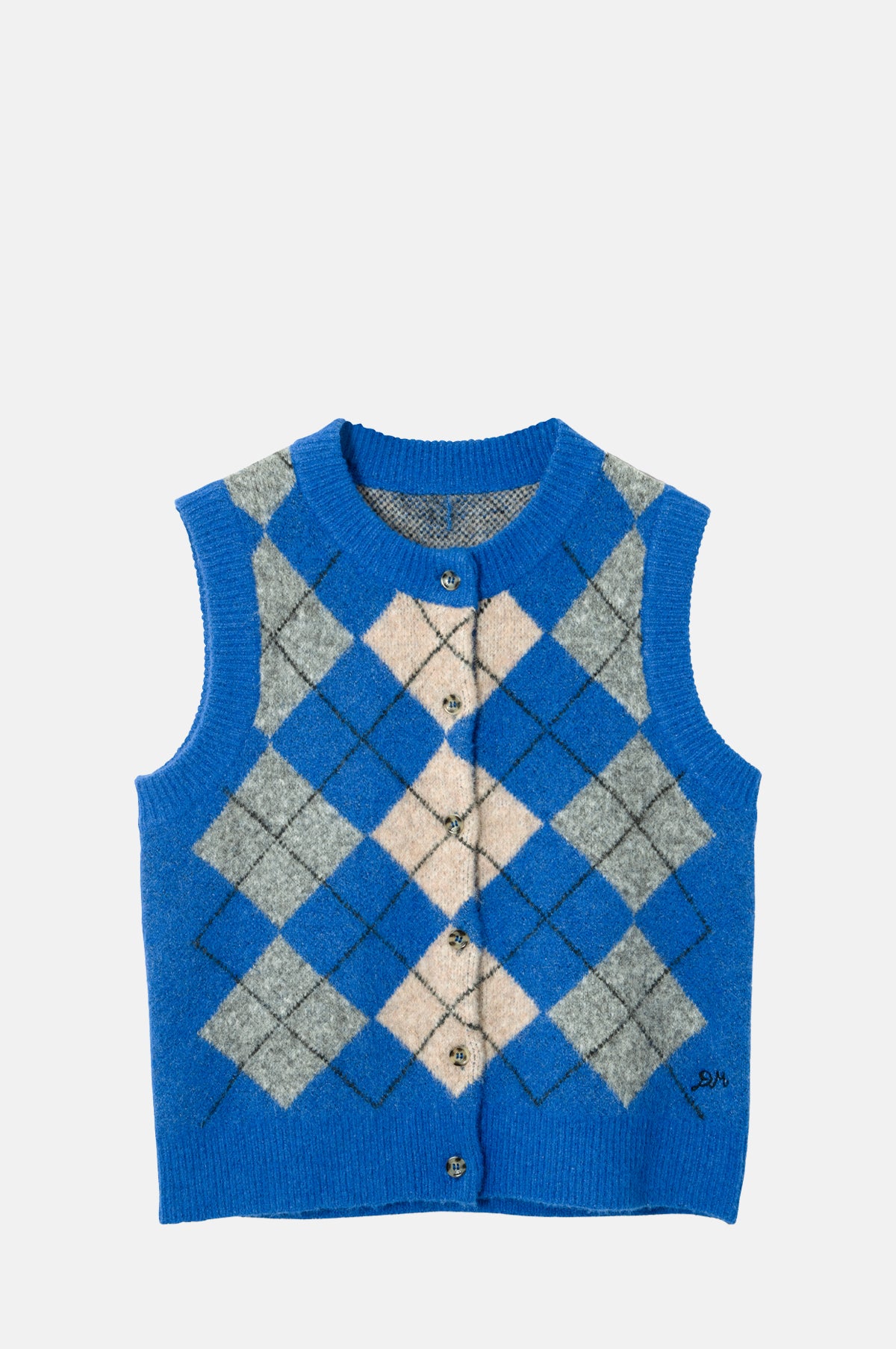 It's safe to say that argyle is back and we plan on channeling Cher Horowitz in this knit vest from Damson Madder. The mixture of bright blue, oatmeal, and charcoal grey give it a fun modern twist. Featuring a crew neck, ribbed detailing, and a button up front - this medium weight knit is ideal for layering.