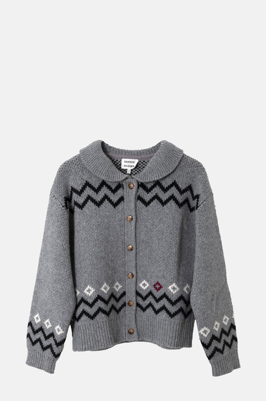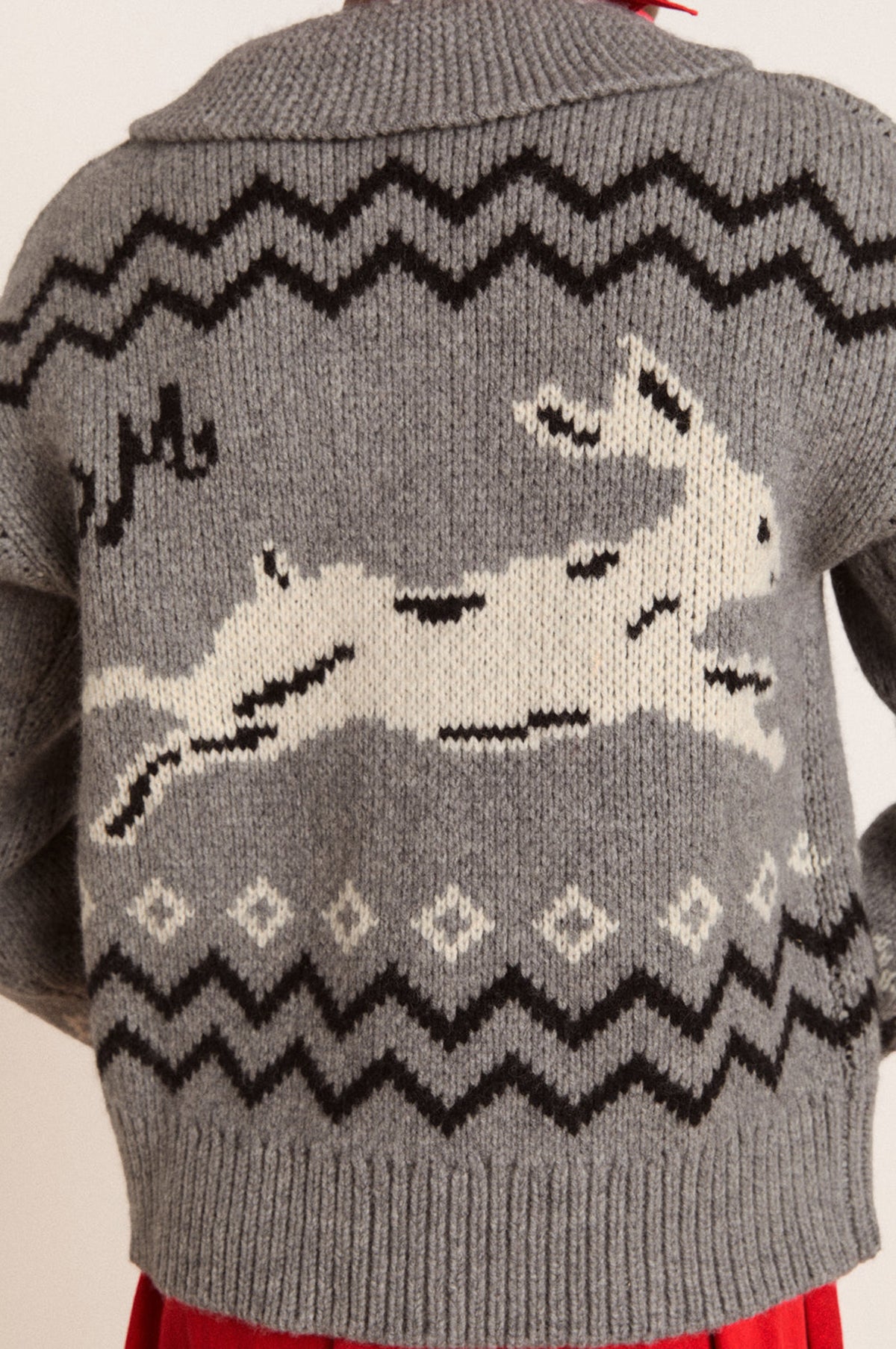 Adding a touch of eccentric whimsy to staple knitwear, the Cecily cardigan offers casual elegance. Designed for a contemporary boxy fit, this heavyweight grey cardigan features a leaping bunny motif on the back, in addition to a contrasting black and white diamond and zig zag pattern which runs around the knit. A peter pan collar and ribbed cuffs and hem finish the design.