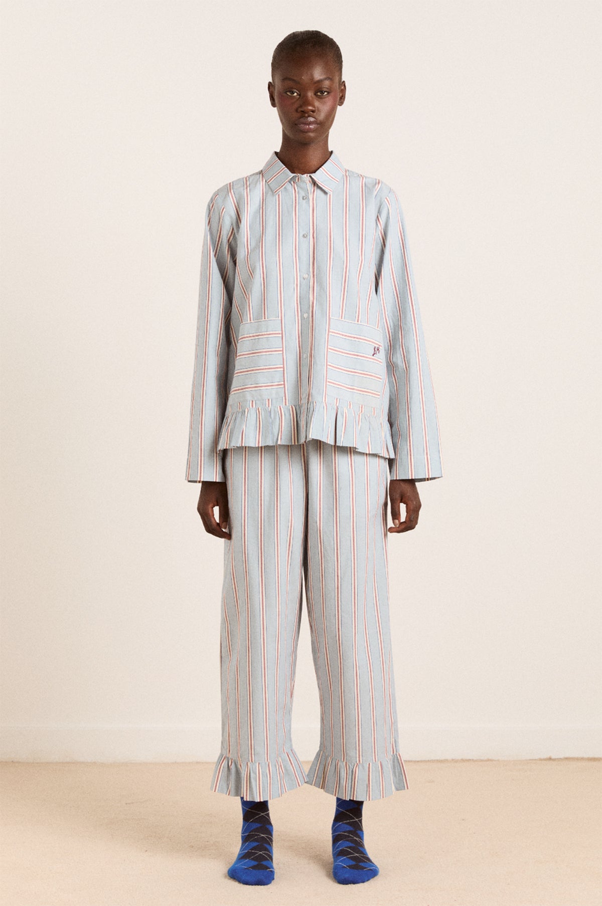 Where function meets frill: introducing the Florie in blue and burgundy stripe. Crafted from 100% organic cotton, this breathable, ultra-comfortable set proves you never have to compromise on style. Complete with fabric storage bag.