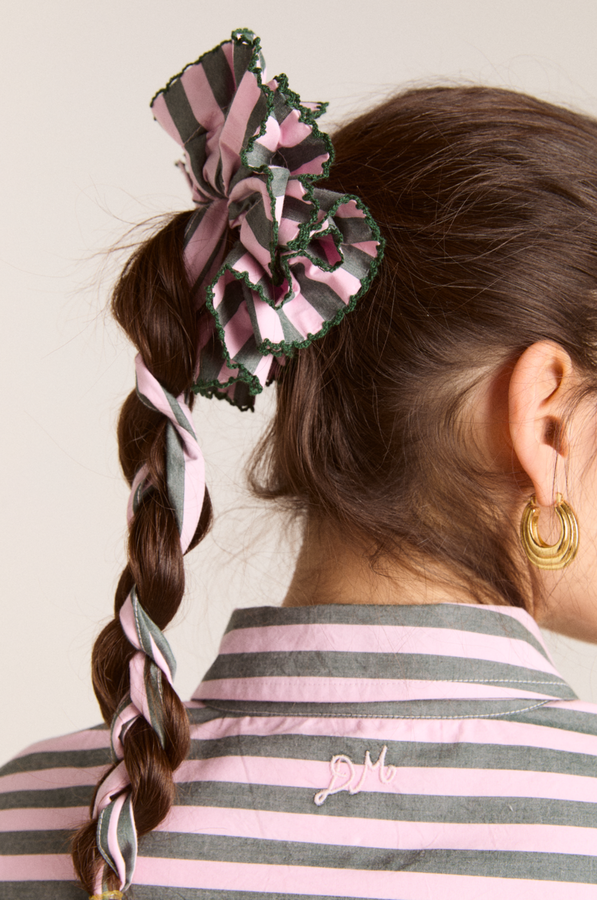 Featuring Damson Madder's signature embroidered logo detail and made from 100% cotton poplin, the Garter Bun Wrap is now available in a preppy pink and green stripe. Designed to be tied in a bow or woven through your plait, this scrunchie will elevate any hairstyle.