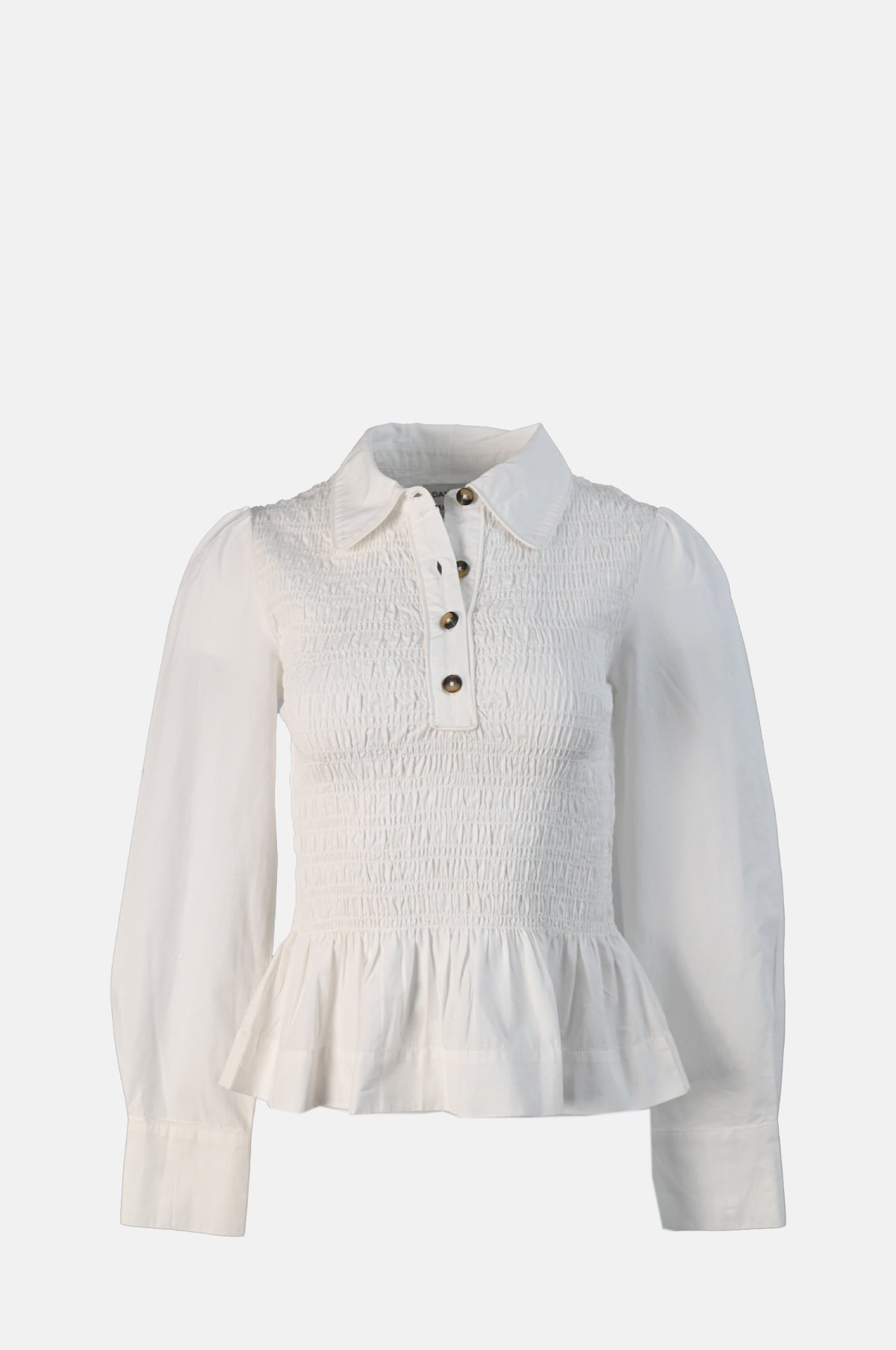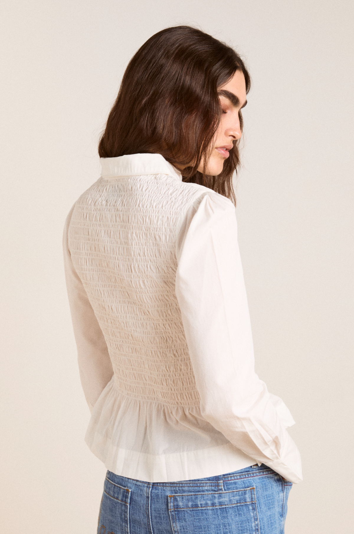 With its form fitting design, this white long-sleeved shirt from Damson Madder is the perfect mix of tailored and feminine. With shirred detailing, a partial button up front, classic collar, and a peplum hem - this piece will pair well with anything in your wardrobe.