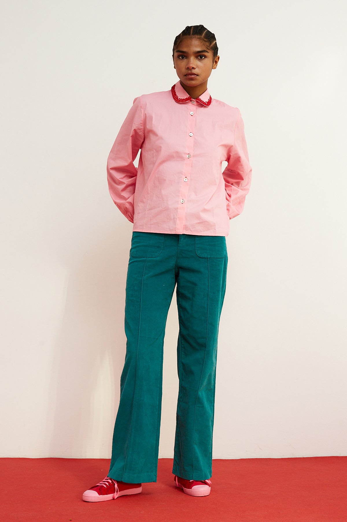 A colourful fashion brand, Dr Bloom's playful collections have been designed for those who want to add a dose of dopamine into their wardrobe. Aptly named the Fun Shirt, this candy pink blouse is accented by textured red trim around the collar. It has a classic shape, button down front, and long sleeves that are elasticated at the wrist. Lovely and vibrant, it looks great worn on its own or layered under a knit vest.