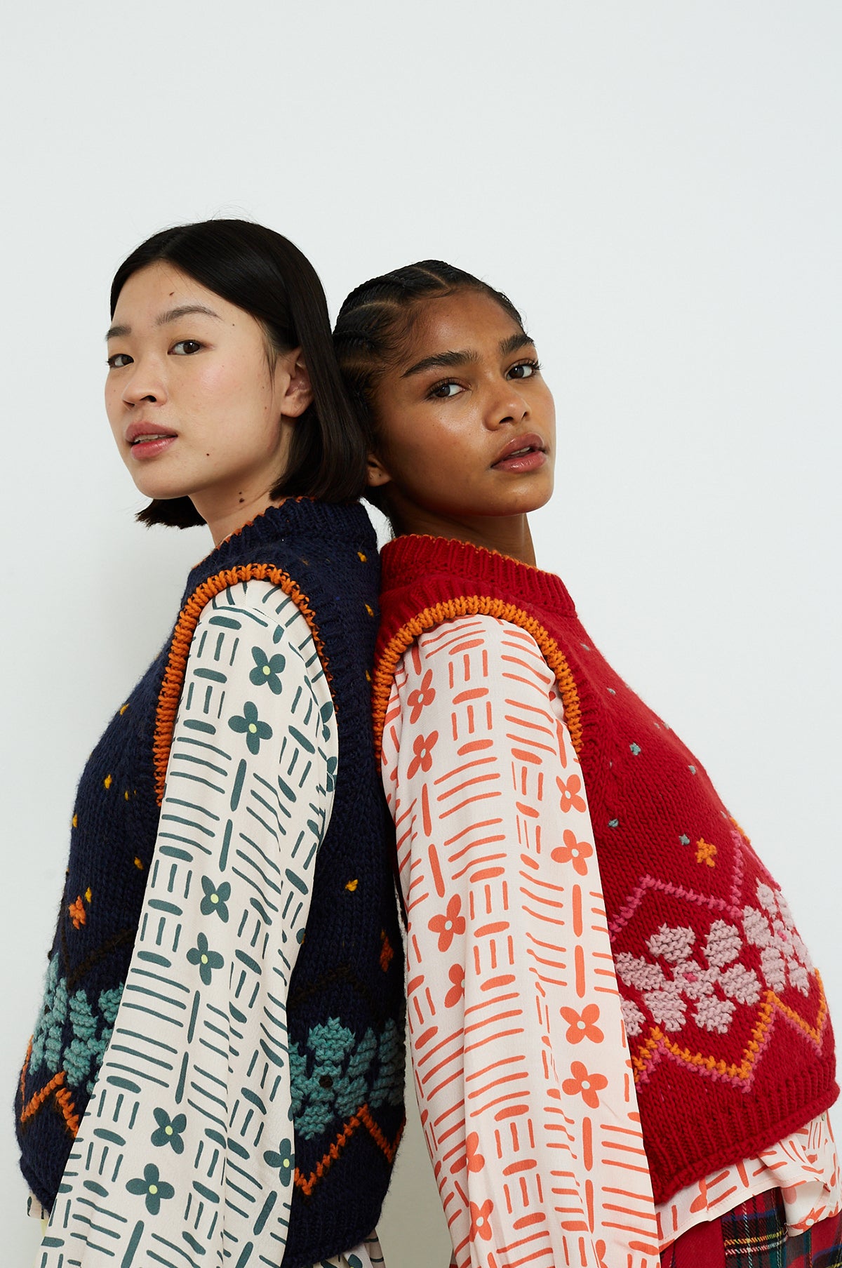 Prints are a fundamental part of Dr Bloom's collections and are a great way to combine different shapes and textures. This chunky red intarsia knit vest feels plush to the touch and is ideal for layering in cooler weather. Pair with dark straight leg jeans, a crisp long-sleeved shirt, and chunky boat shoes.