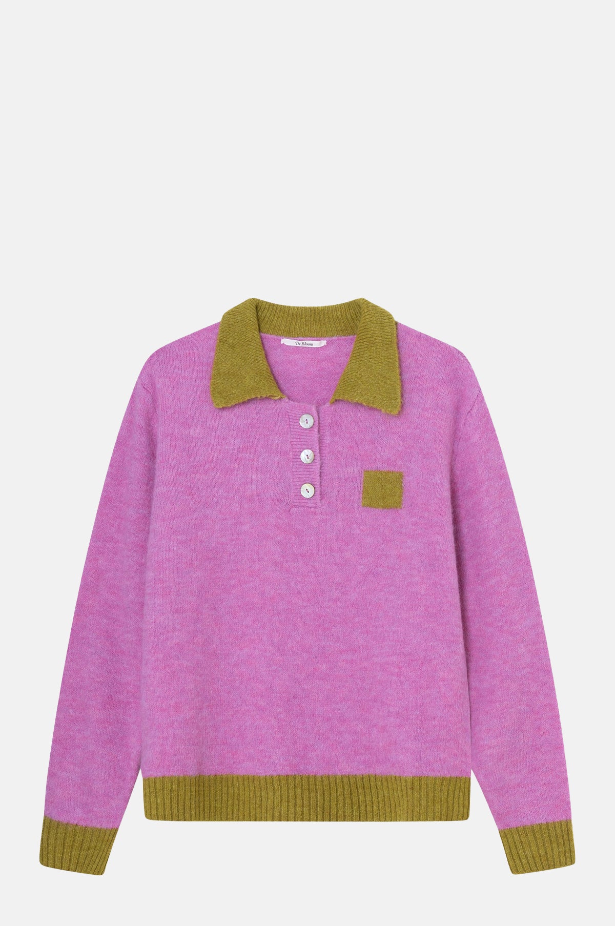 Cheerful and soft, you're sure to stand out in this colourful polo knit jumper from Dr Bloom. In a bright Pepto-Bismol pink with gold colour contrast on the collar, hem, square chest detail, and cuffs it has a straight cut and wide lapel collar accented by three mother of pearl buttons at the neckline. Pair with jeans or simple corduroy trousers for a fun autumnal look