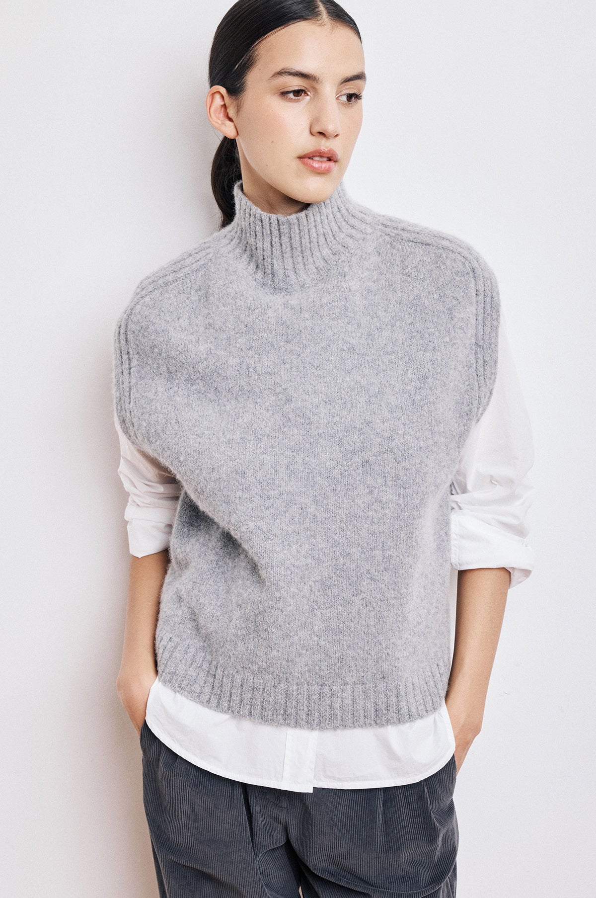 Merveilleux, wunderbar, meraviglioso... this wonderfully versatile sleeveless pullover from Hartford is a chic anchor piece for any cool weather wardrobe. A gorgeous thick knit it has a high neck and ribbed detailing. Structural with just the right amount of slouch, we can think of an infinite number of styling combinations we'd wear this with. A cool poplin top, your comfiest long sleeved tee, great denim, tailored trousers, over dresses ... the list goes on. Available in two colourways this one is a light grey.