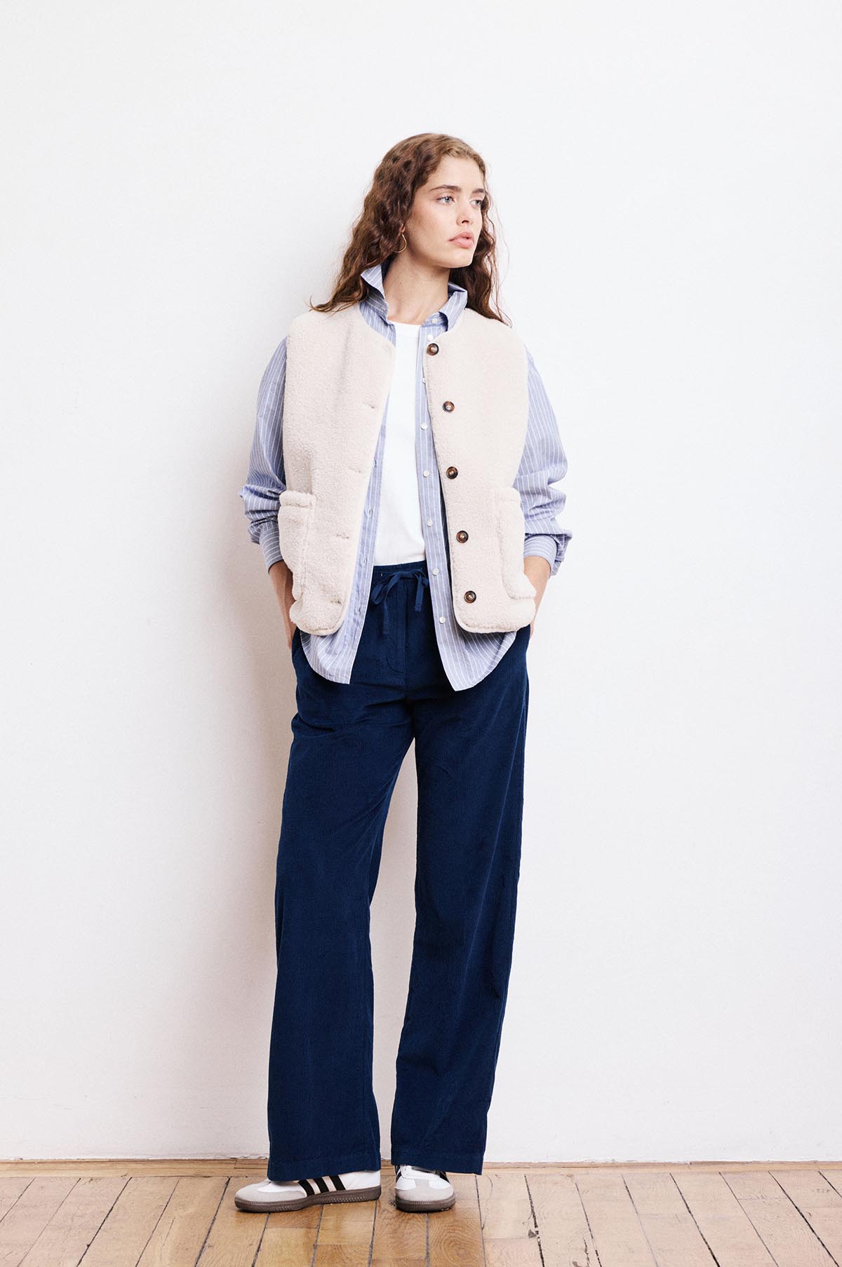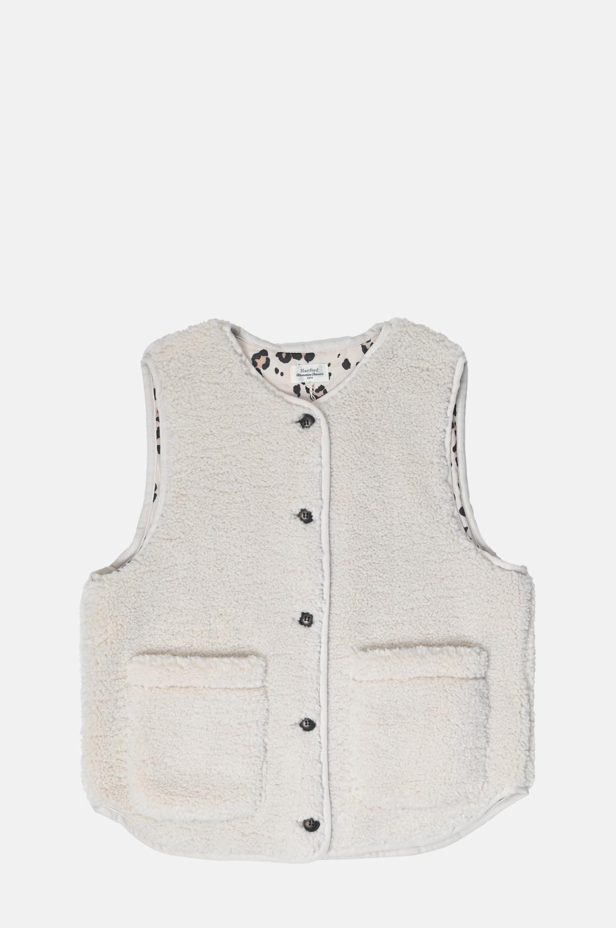 Offering comfort and versatile styling, the Veon vest from Hartford has homestead charm. Cut from a natural coloured lightweight faux fur with front patch pockets and a round neckline. The gilet is finished with off-white piping and a fun leopard print lining.