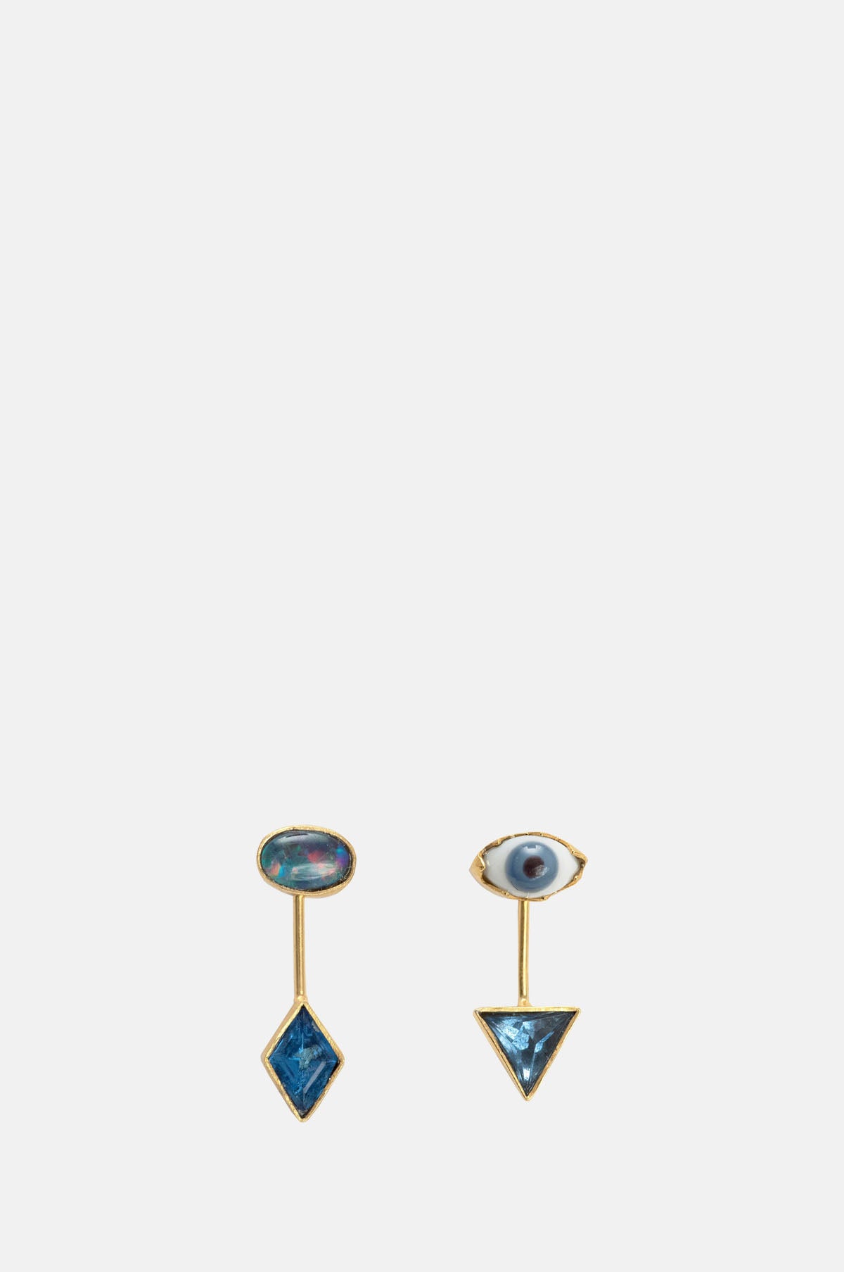 Materials: Ethically sourced 18k gold-plated silver, glass, opal and vintage rhinestone. Fitting: Stud Ear Length: 29mm Width: 9mm Weight: 1g each Painstakingly crafted, each and every object Grainne places in to her compositions are delicately set by hand in silver… each casing measured, carefully, for a snug fit, soldered, pierced and polished, before placing in the tiny object, and rubbing the metal over to secure. As most feature elements are natural or vintage each finished item has a unique look and may vary slightly from the image shown. E-DD5