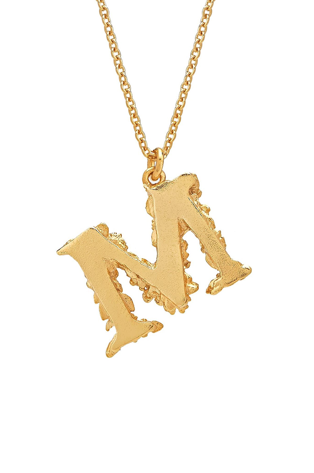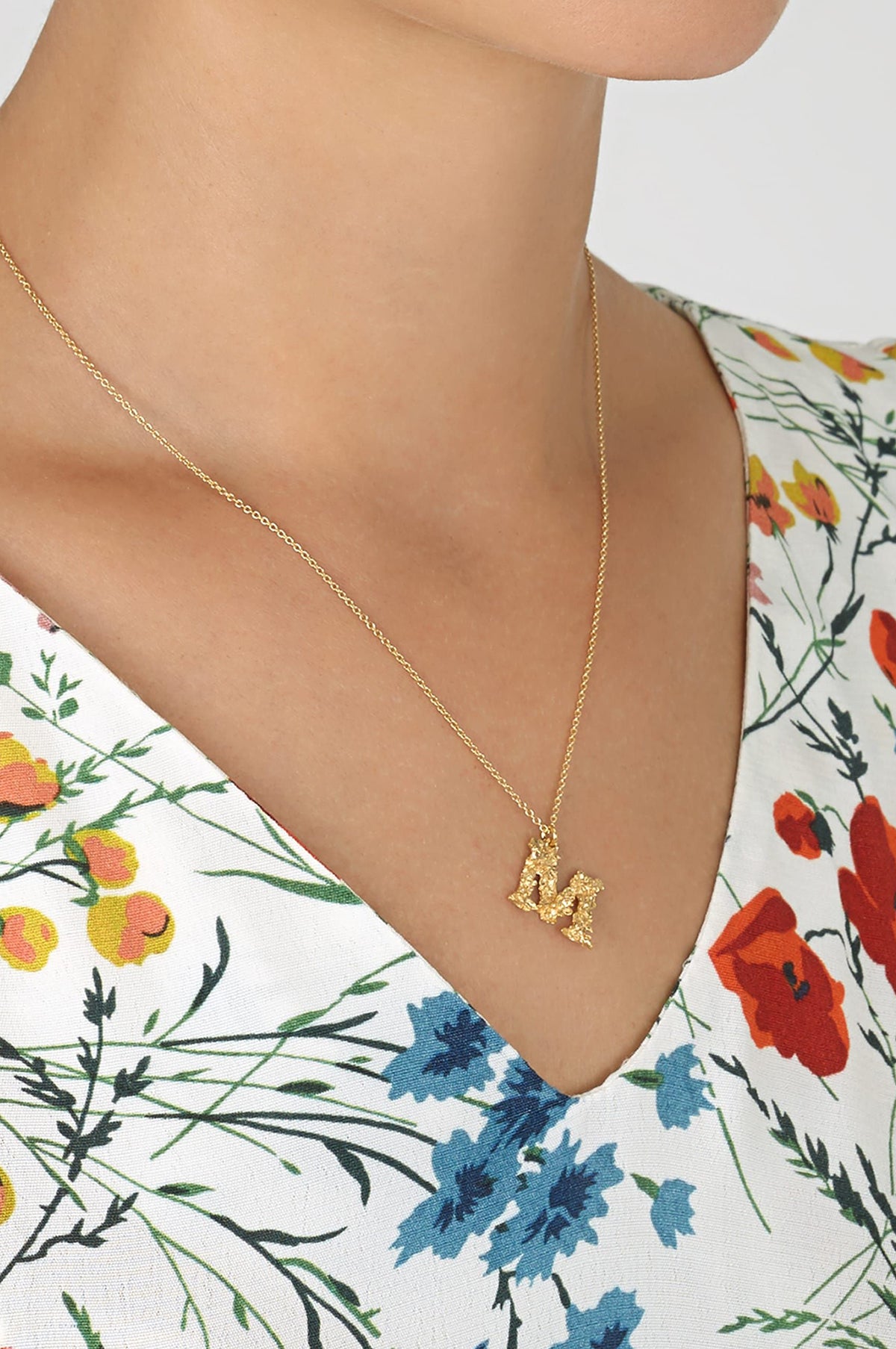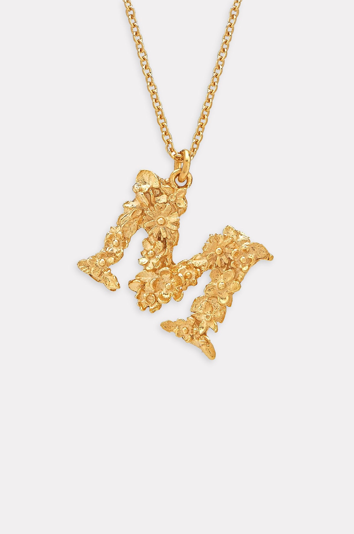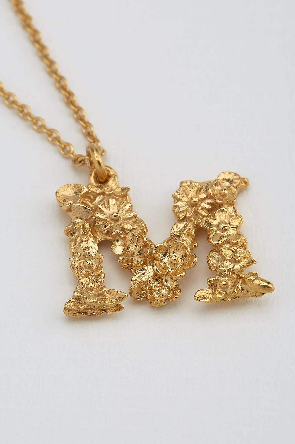 Floral letter 'M' necklace blooming with tangled florals, sculpted leaves and intricate petals from Alex's New Collection 'The Floral Alphabet'.