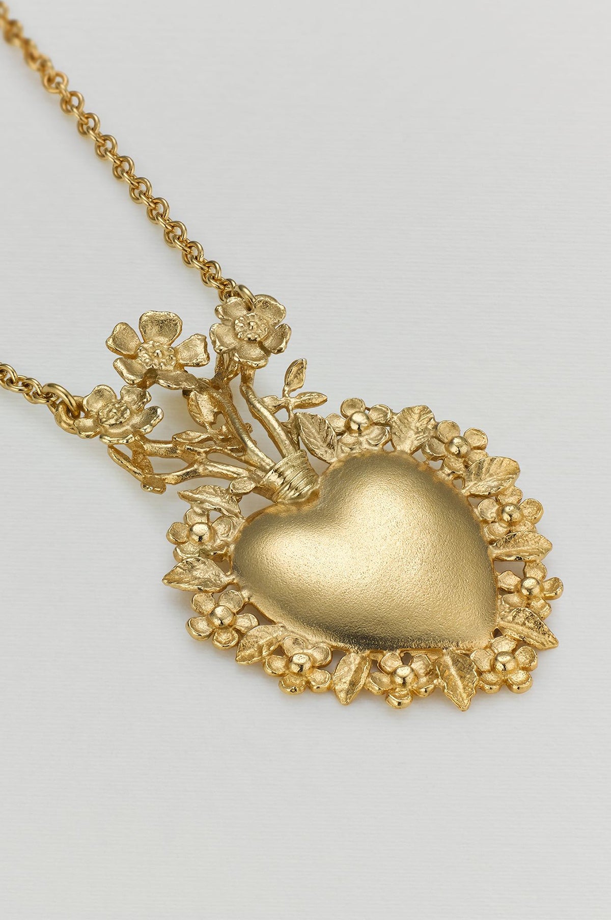 - Pendant necklace featuring a sacred heart pendant adorned with posy and wild rose flowers