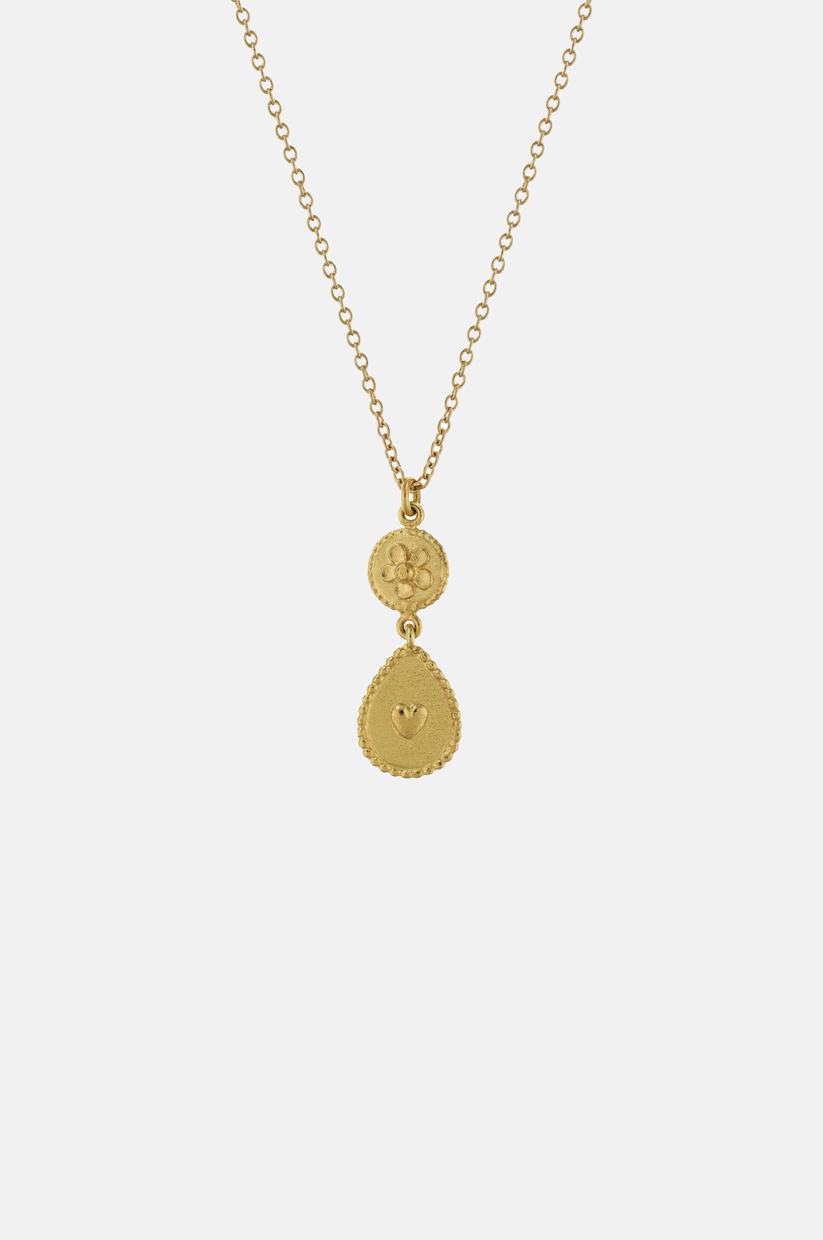 This sweet drop necklace features a posy flower disc and heart teardrop, celebrating a love of nature. A tiny disc featuring a posy flower and heart adorned teardrop celebrates a love of nature. Inspired by Milagros or Ex-Voto tokens, this delicate drop necklace hangs from a classic 16-18” chain, making it a sweet piece to wear alone, or one easily layered with other pieces. Handmade from sterling silver and plated with 22 ct fairmined gold.