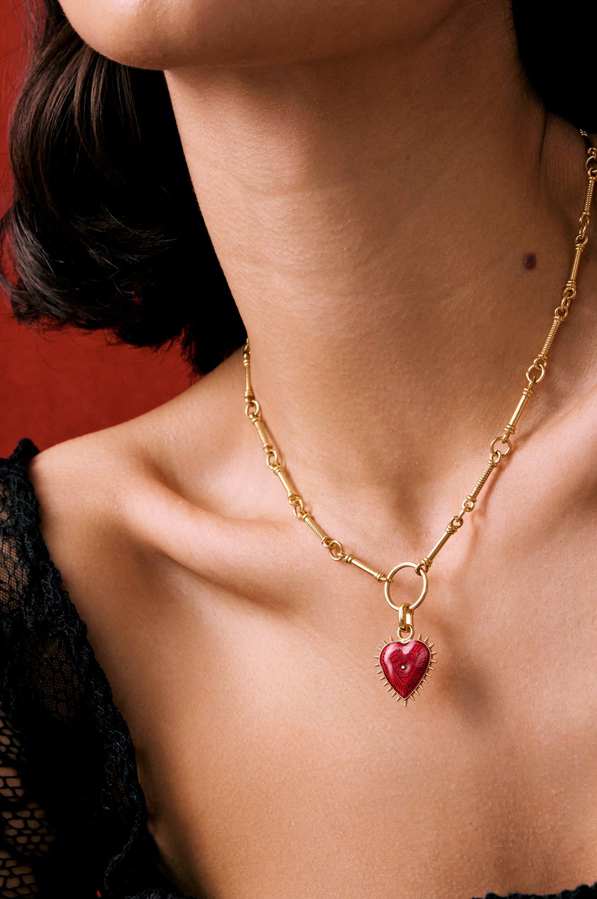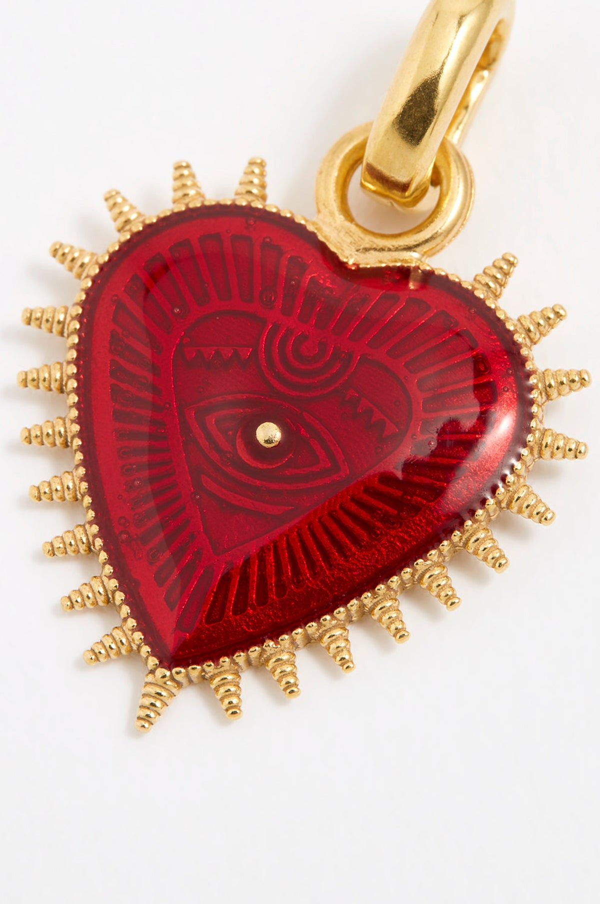 This small heart charm features an intricate border and semi-transparent, glassy red enamel.
