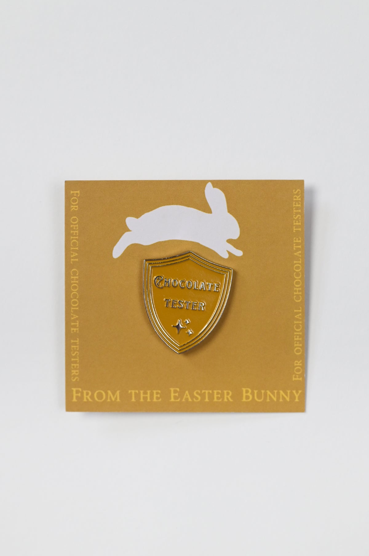 - "Chocolate Tester" metal enamel badge on a backing card