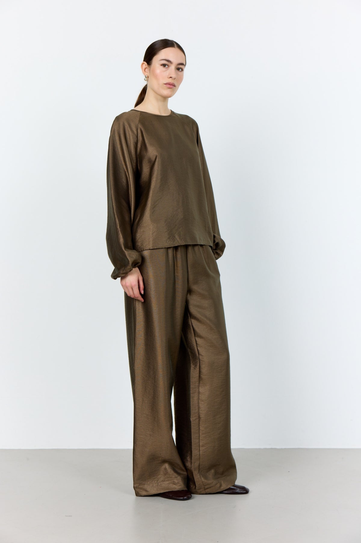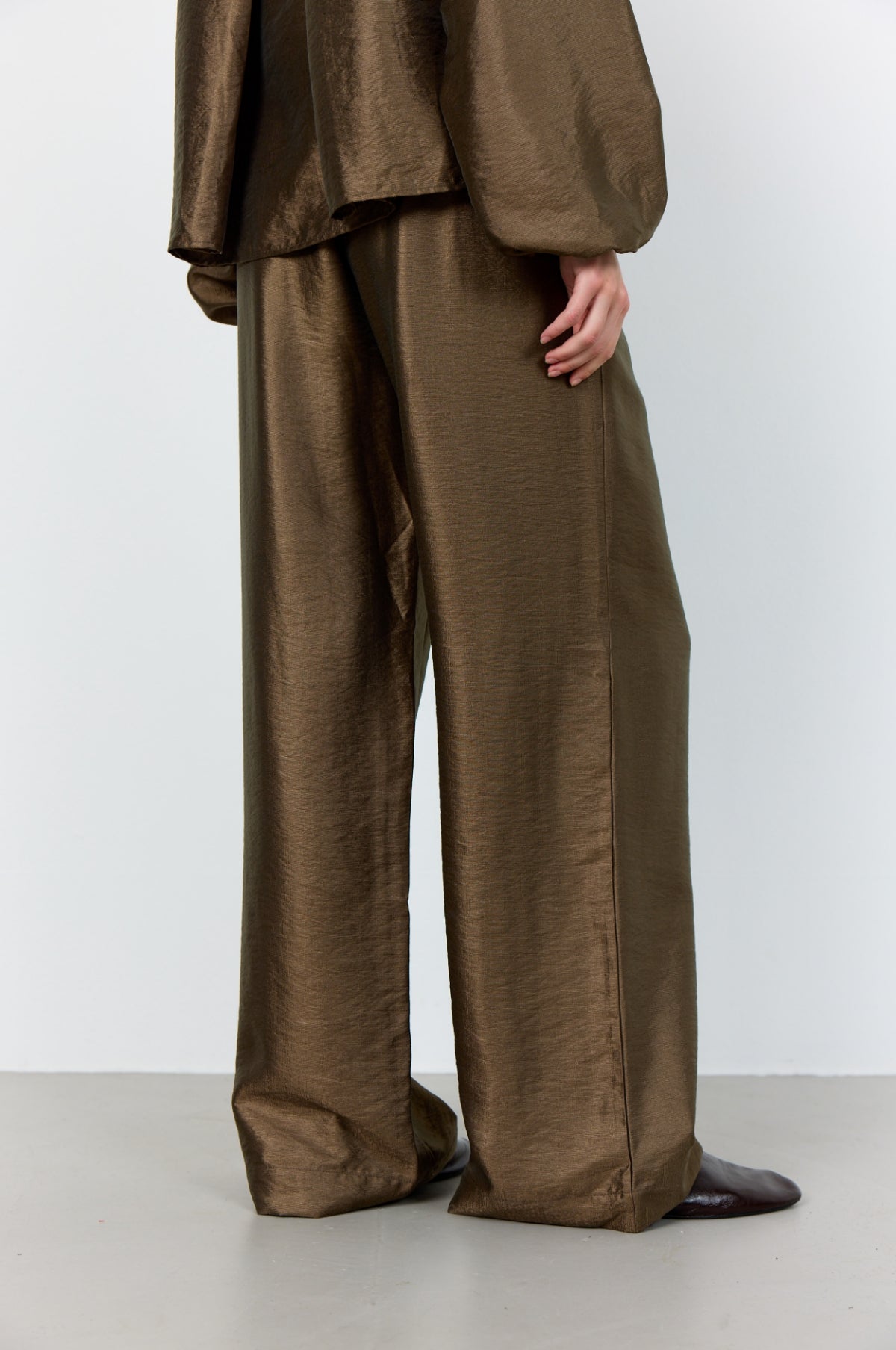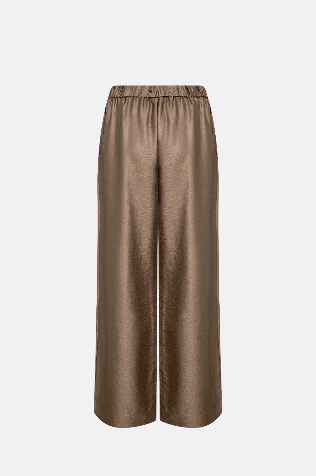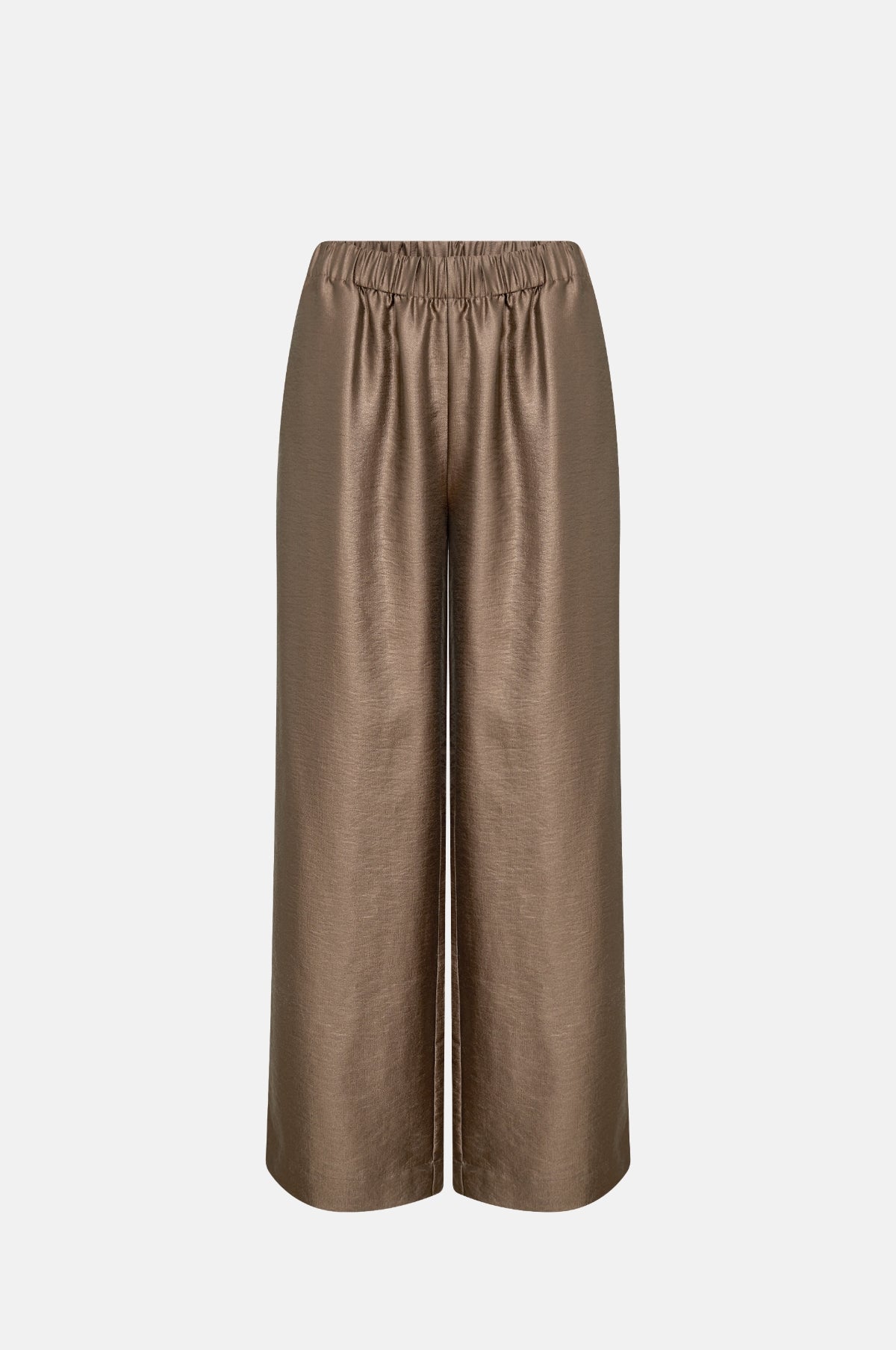 The Nessa pants from Levete Room offer a graceful, flattering and contemporary silhouette. Spun from a metallic bronze material which creates wonderful movement when worn. With an elasticated waistband and side pockets to make getting dressed super easy.