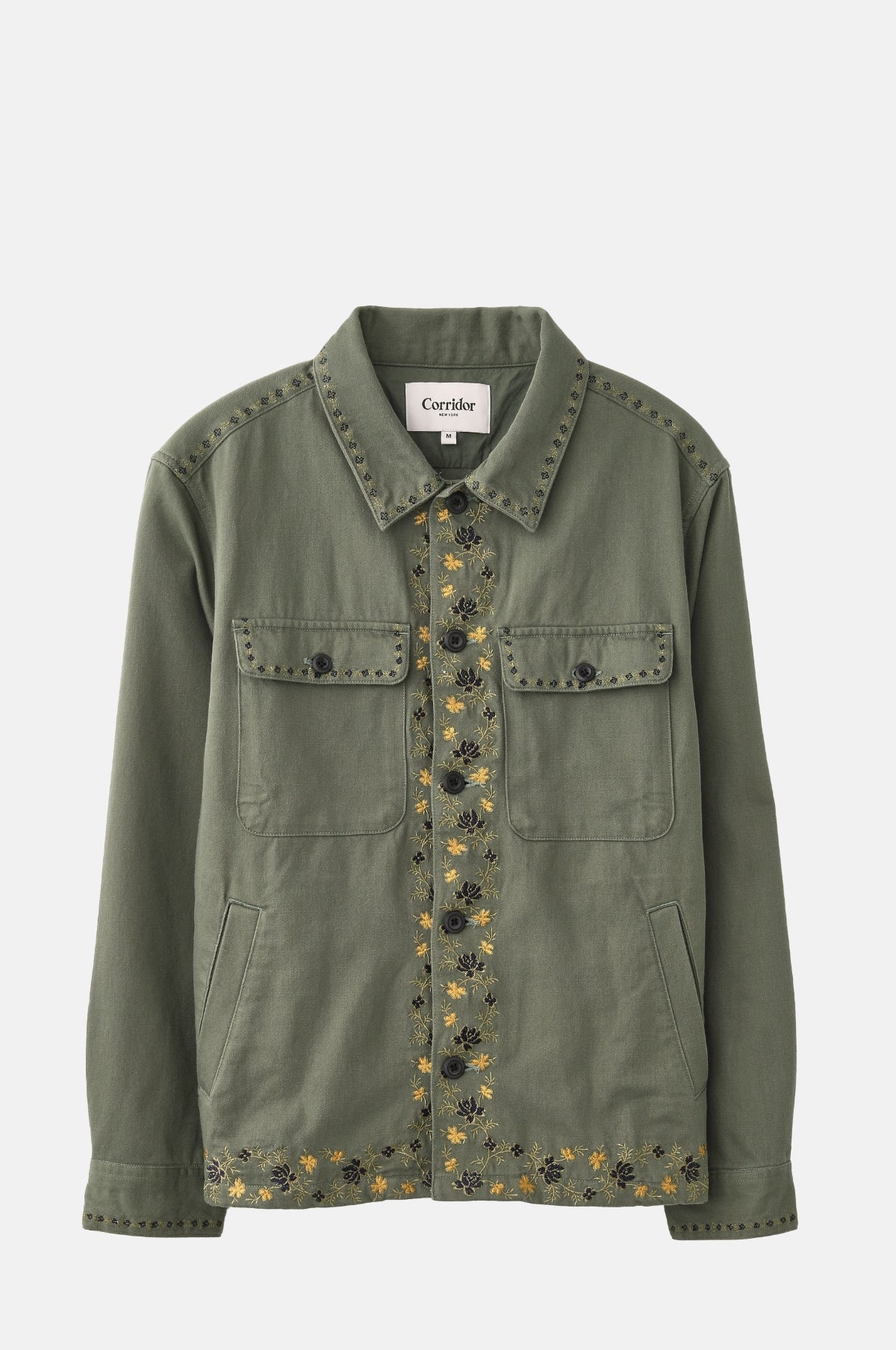The Corridor Embroidered Military Jacket in Olive is a classic military silhouette completed with an embroidered design, two chest pockets and two hand pockets.