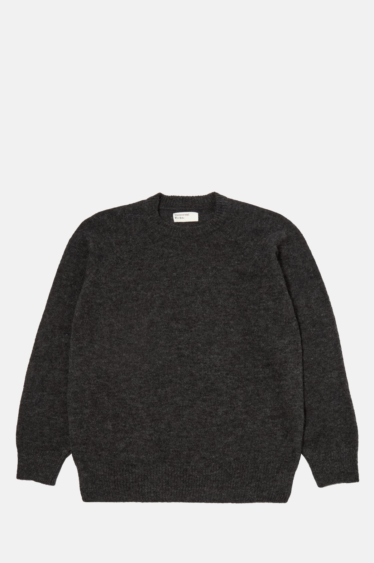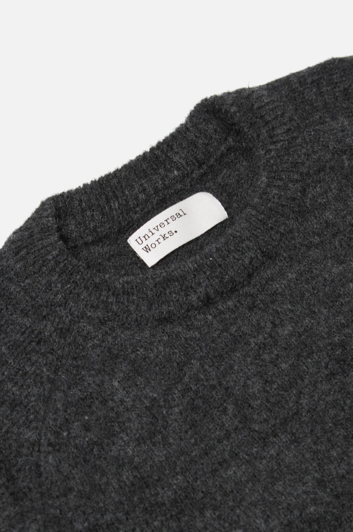 Snug and soft, the Lyon Crew in Charcoal is a loose, ribbed-detail sweater with raglan sleeves. This single-rib knit is exceptionally soft and light, woven on a 7-gauge machine from high alpaca content yarn, for a chunky knit and an exceptionally soft hand feel.