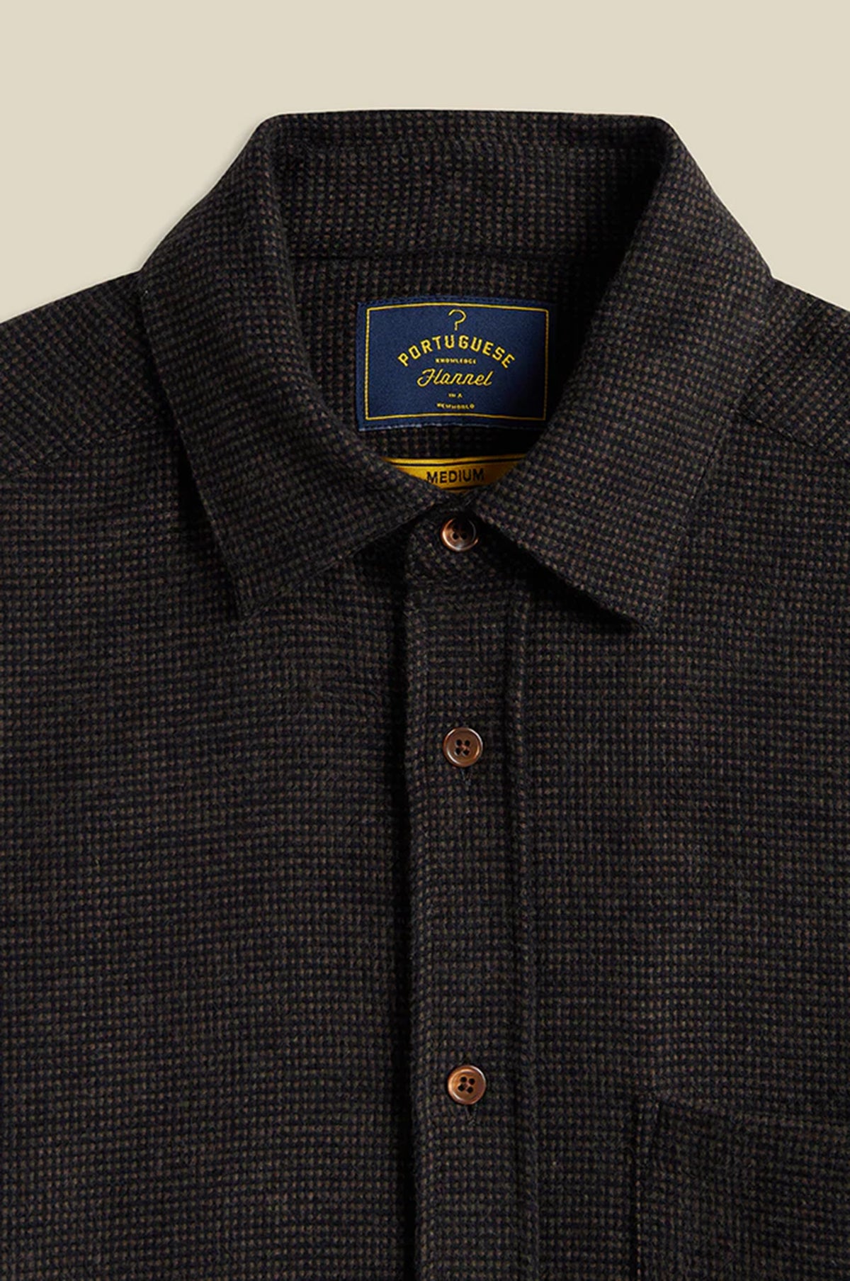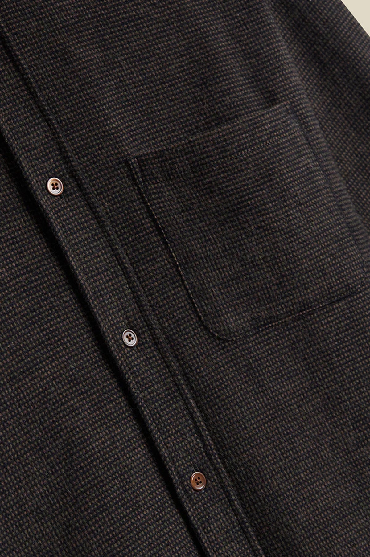 The Sounds Shirt from Portuguese Flannel is constructed of a super soft brushed cotton so it's great for the cooler months Finished with a simple chest pocket, subtle check and regular collar making it incredibly versatile whether you choose to dress it up or down. In person, the overall colour reads as a dark brown.
