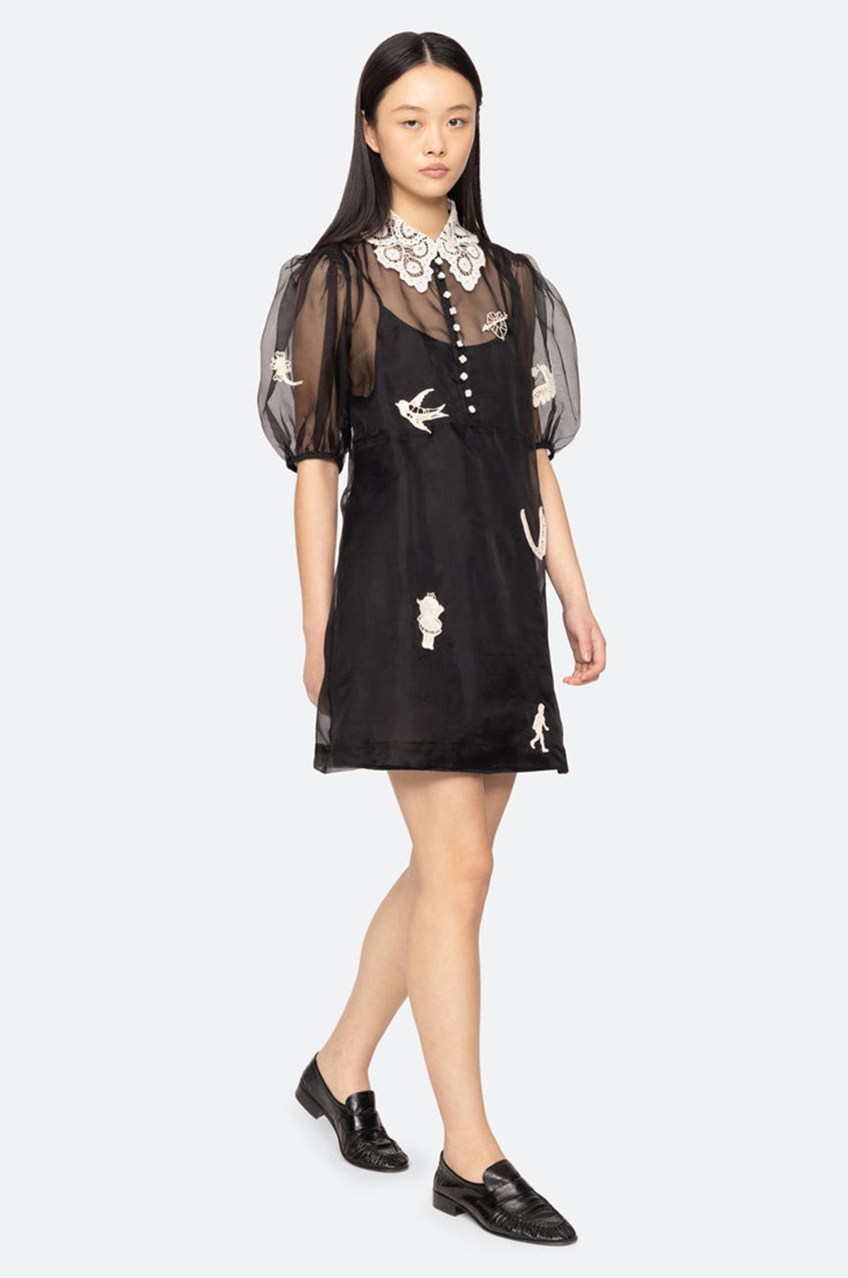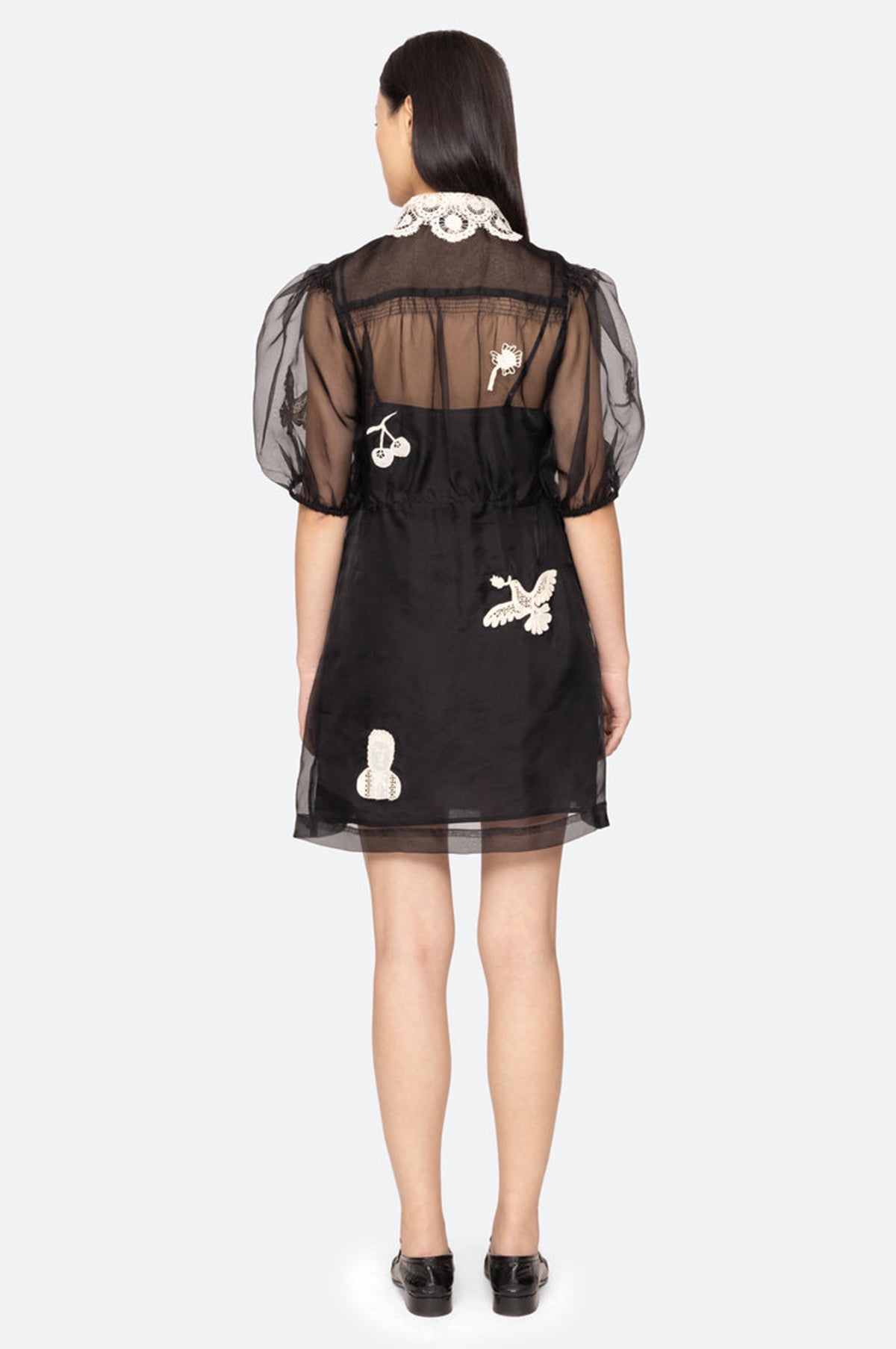 The Ellison mini dress from Sea New York is crafted from sheer black organza fabric with a removable slip for versatile styling. A lace trimmed collar, short puff sleeves, and intricate floral buttons complement the folkloric lace motifs scattered throughout, creating a romantic, vintage-inspired look. Style over tights and boots.