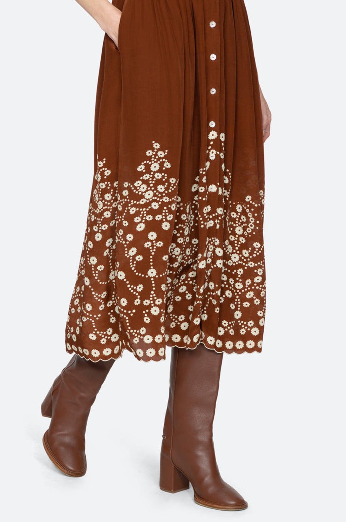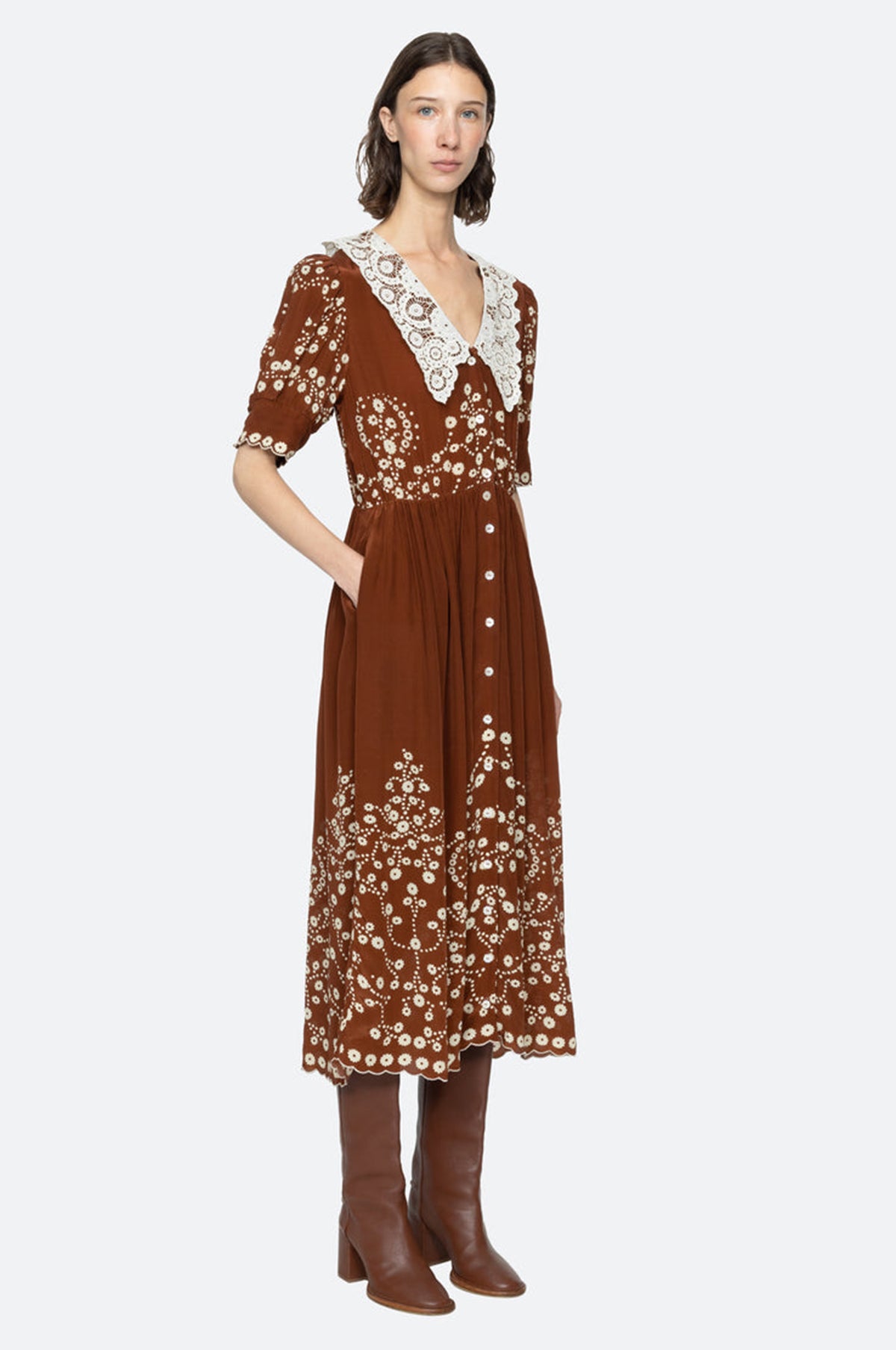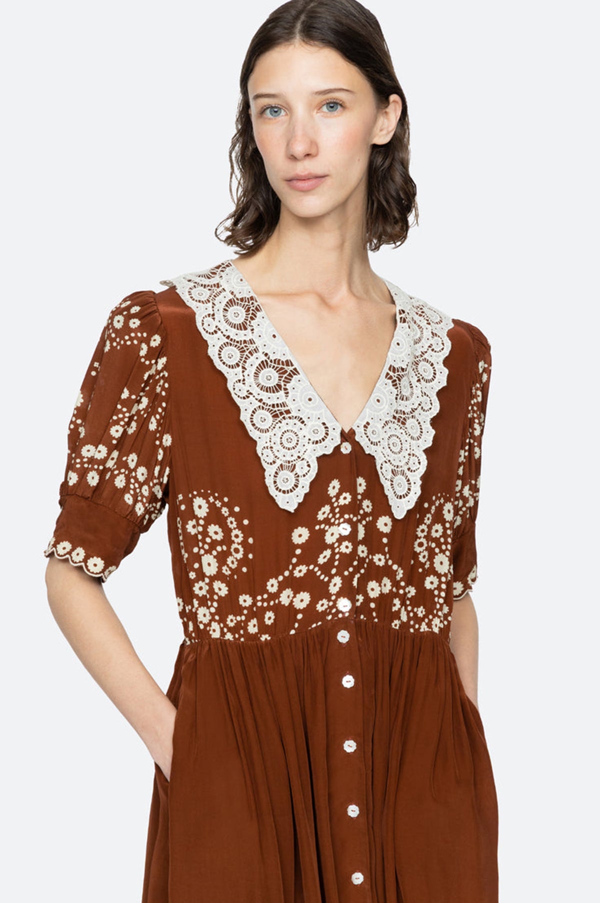 Sea New York delivers yet another stellar dress and this one is called Frances. She is vintage- inspired with a v-neckline framed by a lace trimmed collar and is patterned with a floral print for a touch of romance. Short puff sleeves and floral buttons enhance her charm, while the midi silhouette offers a flattering drape.