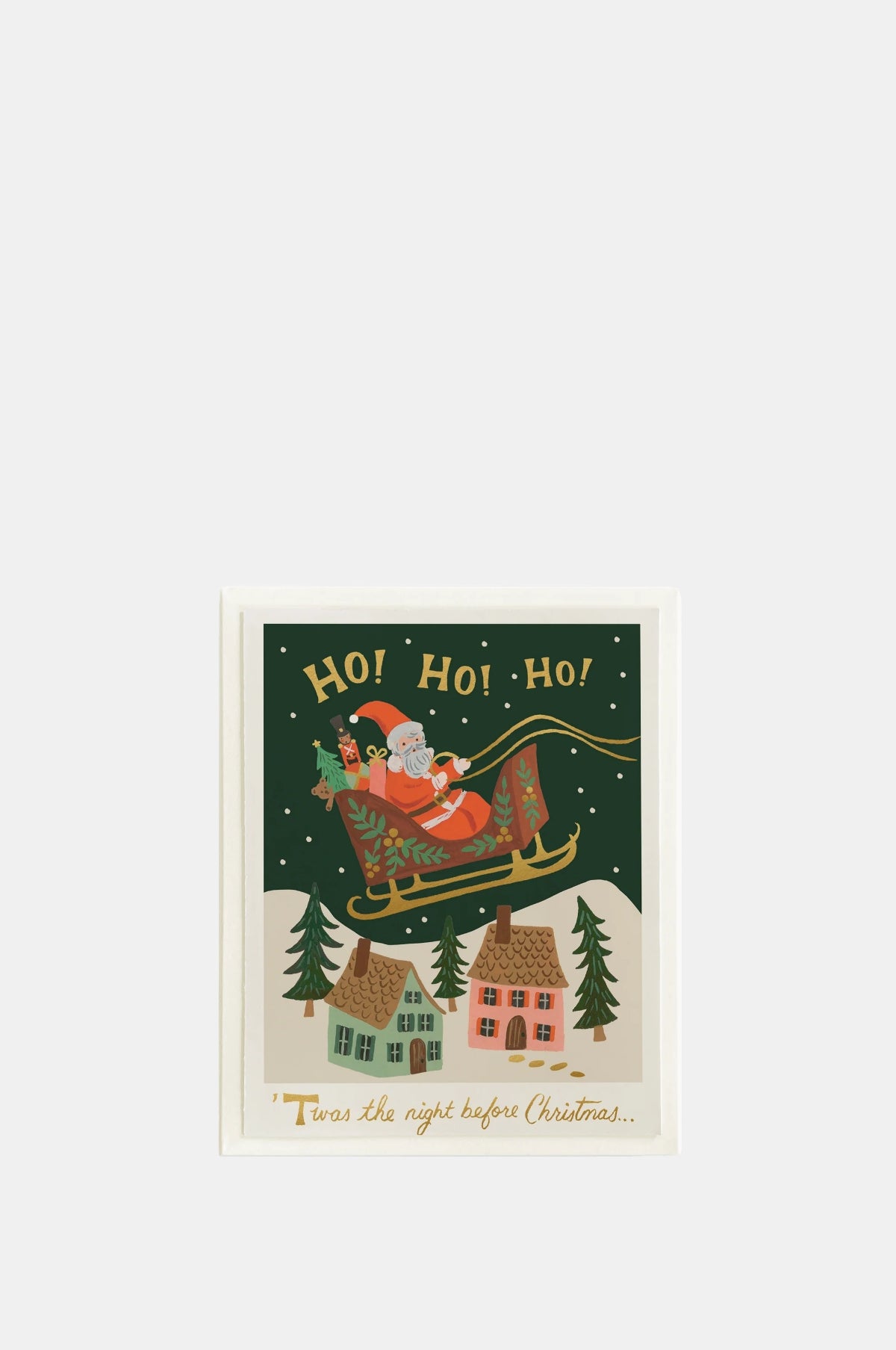 Who's that flying over the rooftops? And on the night before Christmas?! It looks like Santa making a special Christmas delivery! A charming colourful Christmas card for all ages with festive gold-foil accents.