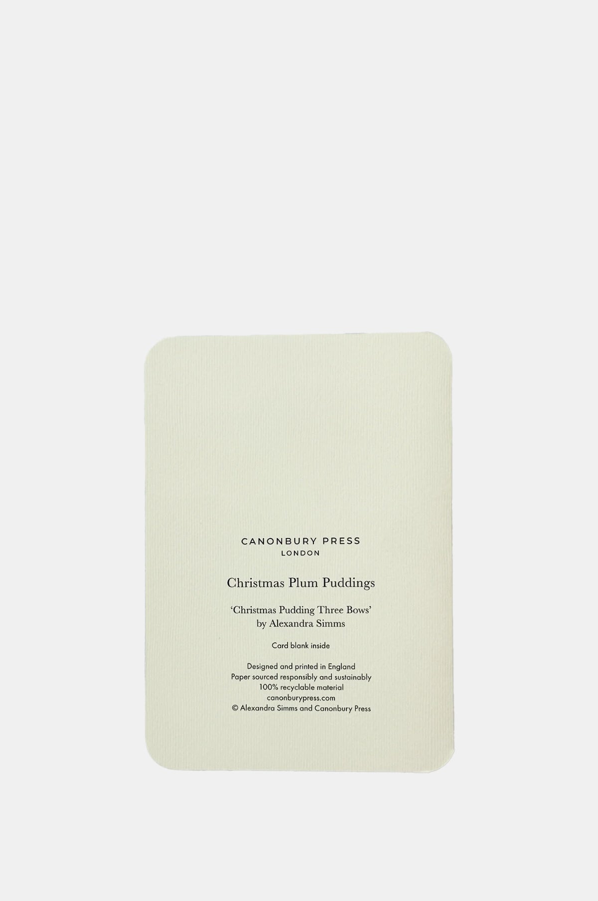 Inspired by decorative Victorian plum puddings, this festive card features a Christmas pudding richly adorned with three red gingham bows and seasonal greenery. Photographed by Alexandra Simms and printed in England, this is a nostalgic and joyful choice for seasonal greetings or to accompany a thoughtfully wrapped gift.