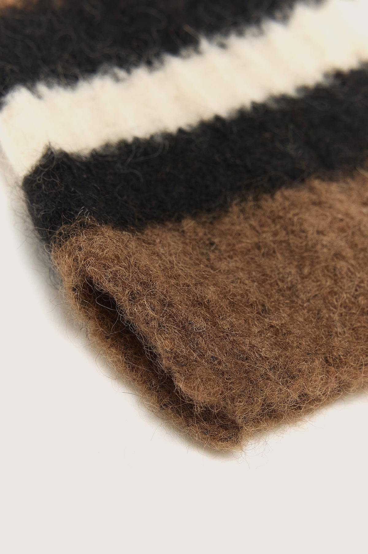 For winter accessories it is the co-ord hat and glove look that is back in a big way. This sporty pair of classic fingerless gloves from Bellerose brings a dose of casual cool to any outfit. Made from a wool blend they are snug and insulating (while practical having your fingers free to use!). Stripe detailing offers a nostalgic nod to '70s athletic wear. Available in two colour ways - this one in brown with a cream and black stripe.