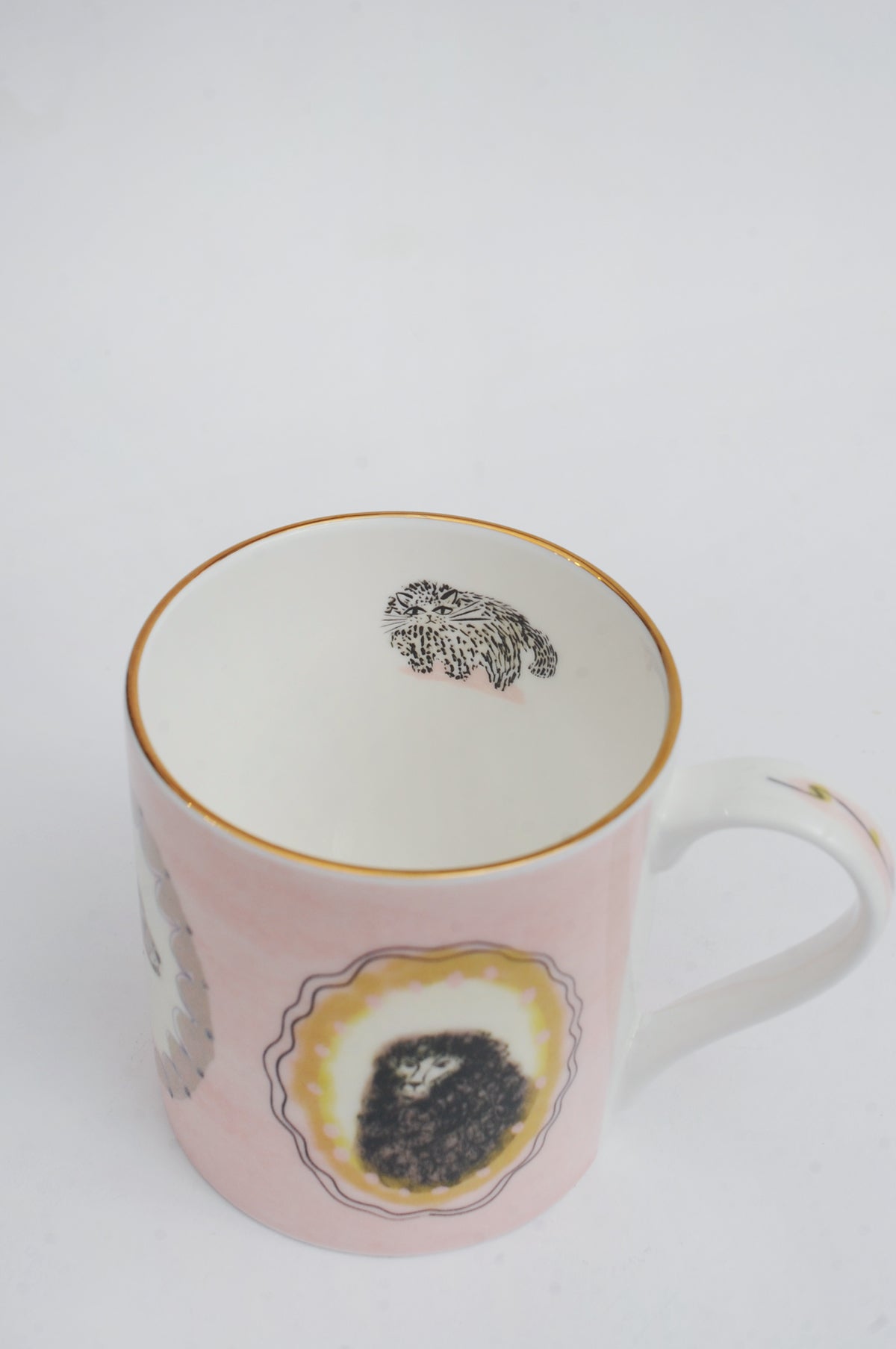 Hand decorated in Stoke by our new friends Mark and Eileen, this mug is made of bone china, in a palette of washed out pinks, taupe and mustard. Adorned with an assortment of illustrated dogs, it is generously but elegantly proportioned and complete with gold detailing around the rim. Our favourite bit? The hidden cat on the inside.