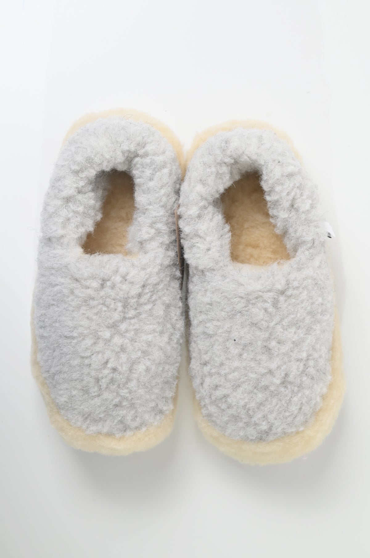 Experience unparalleled, long lasting comfort with the Yoko Wool full slippers, aptly named "Walking on the Cloud Slippers". Designed to cradle your feet in plush softness, these slippers offer the perfect blend of warmth and coziness for indoor relaxation as they are made from 100% wool pile with a synthetic sole. Available in a variety of colours: these ones are light grey with a cream base.