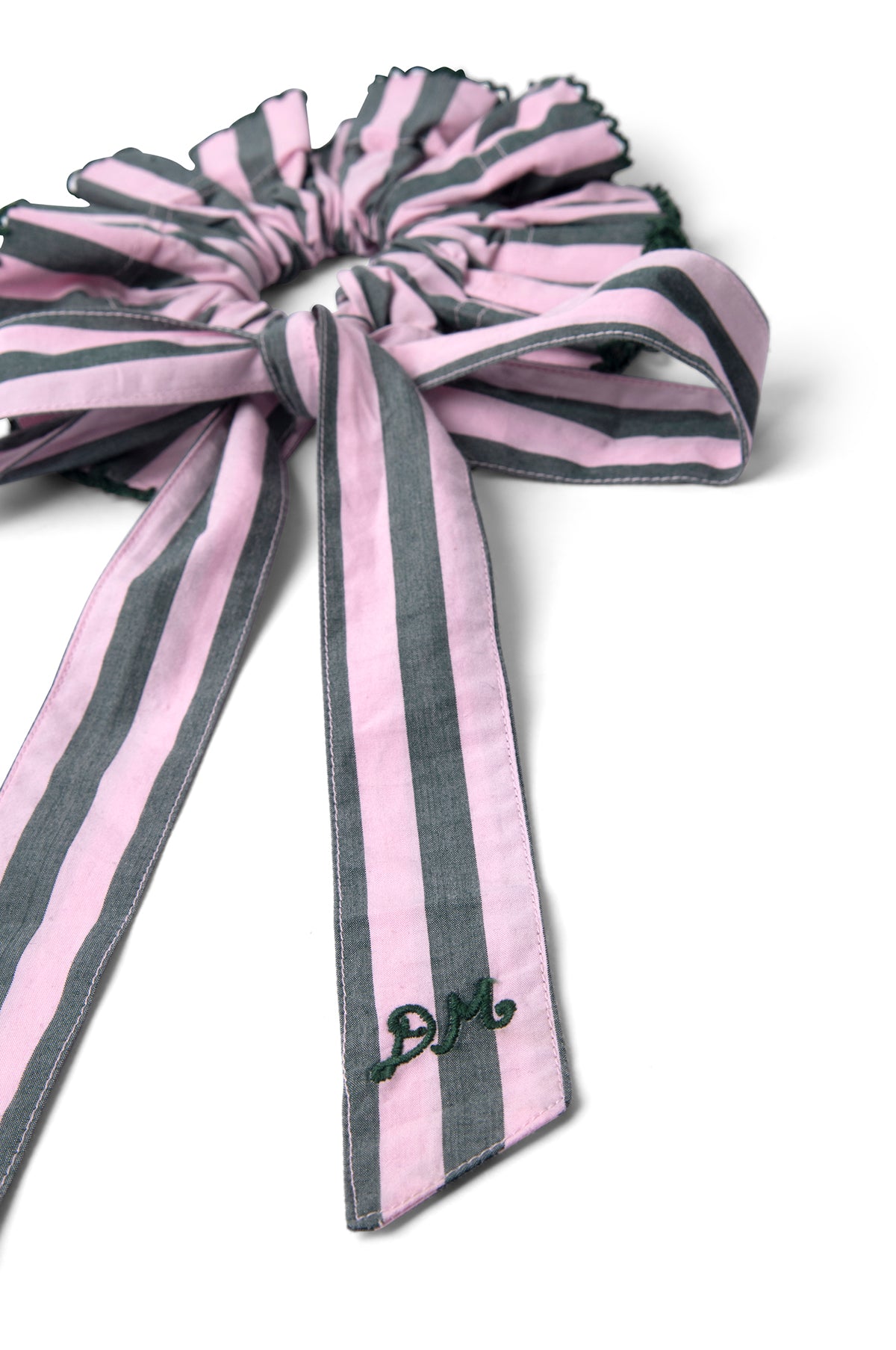 Featuring Damson Madder's signature embroidered logo detail and made from 100% cotton poplin, the Garter Bun Wrap is now available in a preppy pink and green stripe. Designed to be tied in a bow or woven through your plait, this scrunchie will elevate any hairstyle.