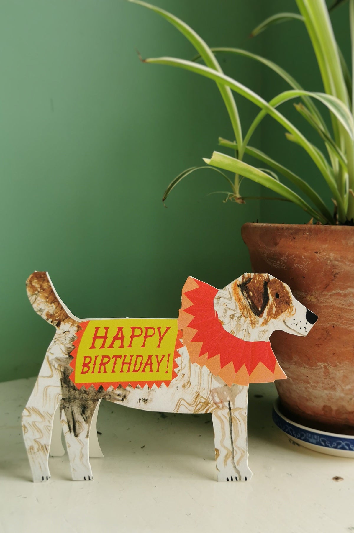 The Happy Birthday Jack Russell! This gorgeous salty little terrier dog has been painted with a scratchy scruffy paintbrush using a mix of gouache and water colour. He is wearing a superbly stylish collaged ruff, as all dogs should. That's why he's smiling; he knows how smart he looks. The card reads "Happy Birthday" and makes an ideal birthday card for the Jack Russell owner, dog lover, or for anyone who would be cheered by this happy, fancy ruff-wearing terrier...that's everyone isn't it?