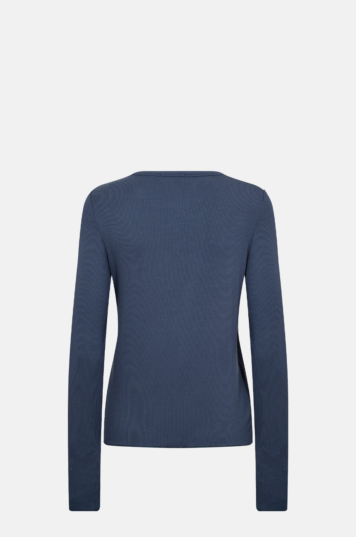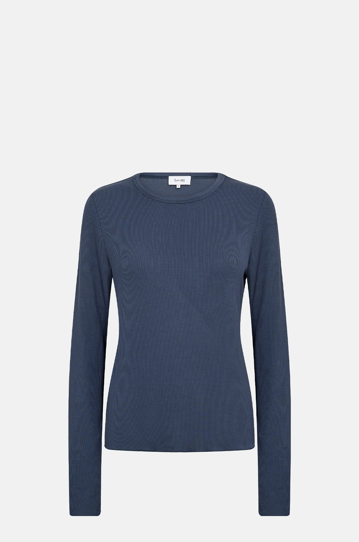 Ika is a midnight blue ribbed long-sleeved tee from Levete Room. Made primarily from Ecovero Viscose it has the perfect amount of stretch and looks lovely layered or on its own. Soft to the touch this feels like a second skin and is wonderfully comfortable on.