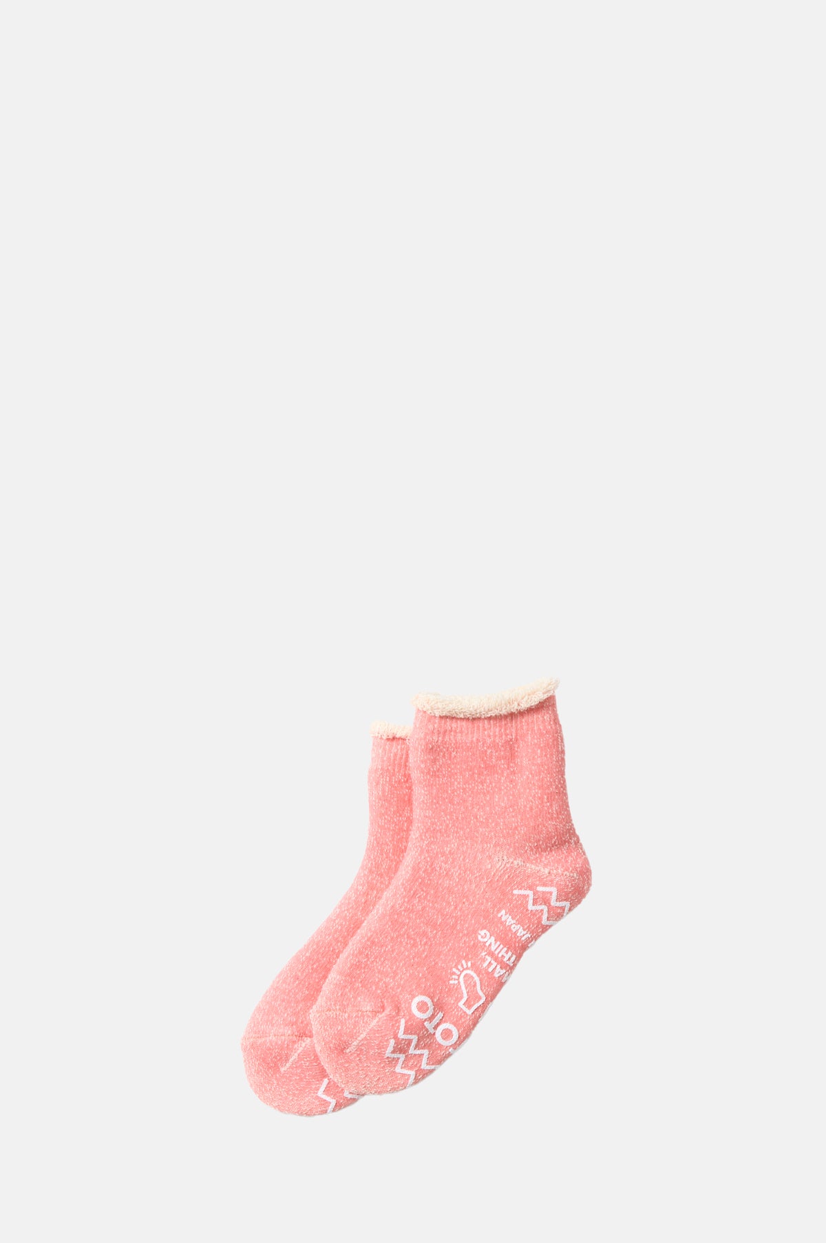 How adorable are these? These sweet socks are perfect for keeping tiny feet toasty. Produced in Japan using the double-layered “Double Face” design, allowing for different materials to be knitted on the outside and the inside of the sock to utilise different thread properties - producing a supremely comfortable sock. In a flecked coral pink colourway and with an anti-slip sole for extra grip. Also available in blue and green.